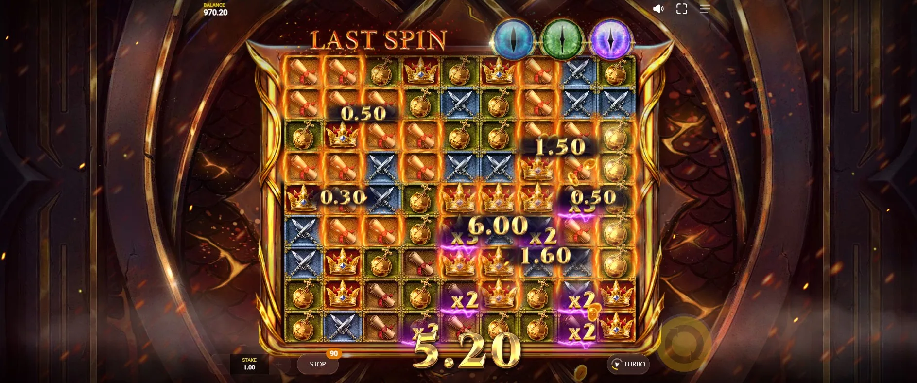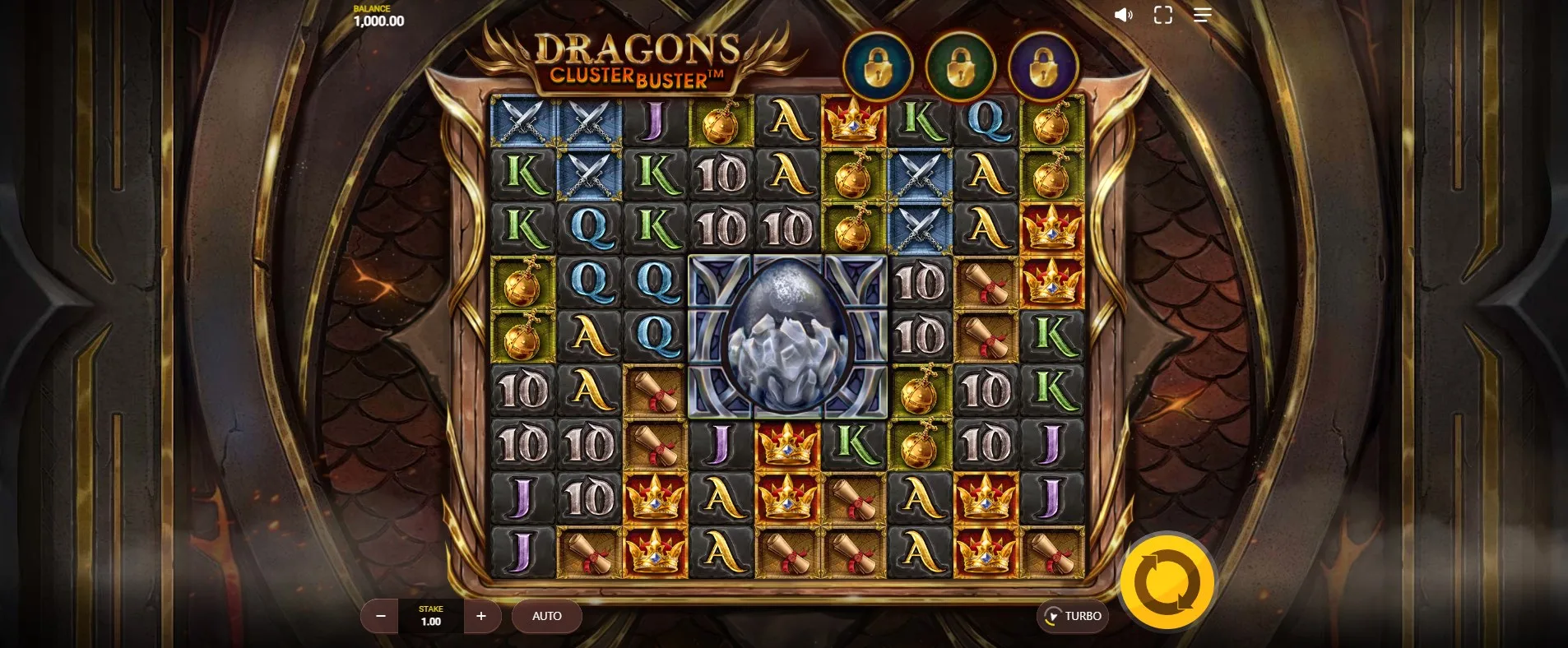Visually, Dragons Clusterbuster is a refined and immersive experience. The background features scaled textures, claw marks, and warm, glowing lighting that suggests you’re inside a dragon’s cave or at the gates of its hoard. It’s mysterious, yet inviting—blending medieval fantasy aesthetics with modern polish.The game grid is prominently displayed at the center, flanked by dragon motifs and bordered with gold filigree. The focal point is the 3×3 Clusterbuster block, housing a glowing dragon’s egg that pulses with magical energy. Above the reels, you’ll see three Dragon Eye indicators that track feature unlocks in Blue, Green, and Purple.