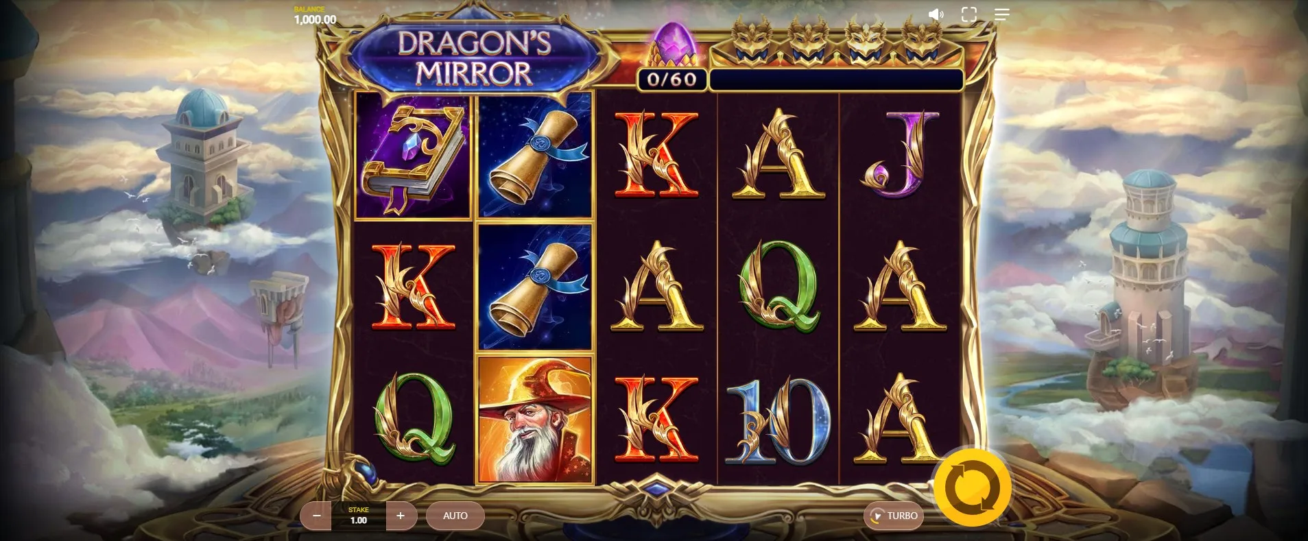 Dragon’s Mirror is visually lush, fully committing to its fantasy setting. Players are transported to a realm of floating towers, mist-shrouded valleys, and mystical landscapes that feel like a blend of Game of Thrones, Avatar, and Lord of the Rings. The reels themselves are encased in ornate golden frames, while magical symbols—books, scrolls, rings, wizards, and dragons—populate the grid.