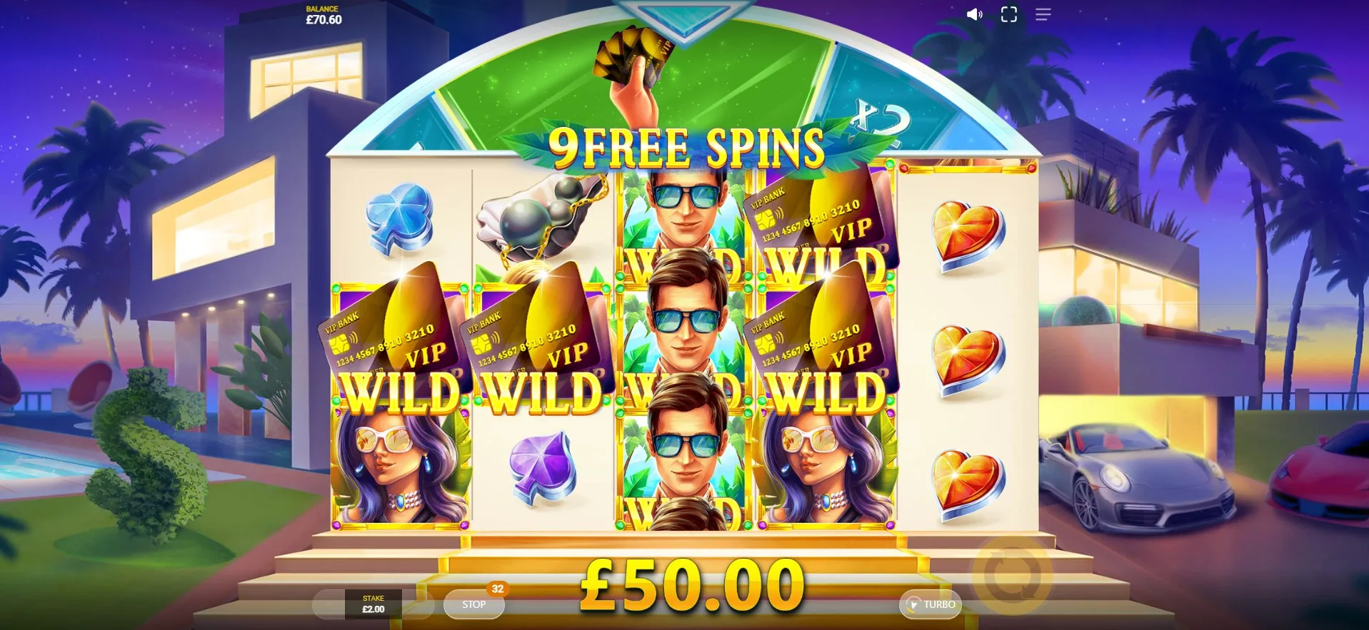 The symbols continue the theme, with the high-paying icons featuring items like cigars and whisky, pearls in an oyster shell, designer handbags stuffed with cash, and an affluent-looking lady who appears positively overwhelmed by her riches. A suave gentleman wearing sunglasses and a smirk (a nod to 1980s playboys like Larry Laffer) appears as one of two wilds, while lower-paying symbols are gem-encrusted suits of cards: clubs, diamonds, hearts, and spades.
