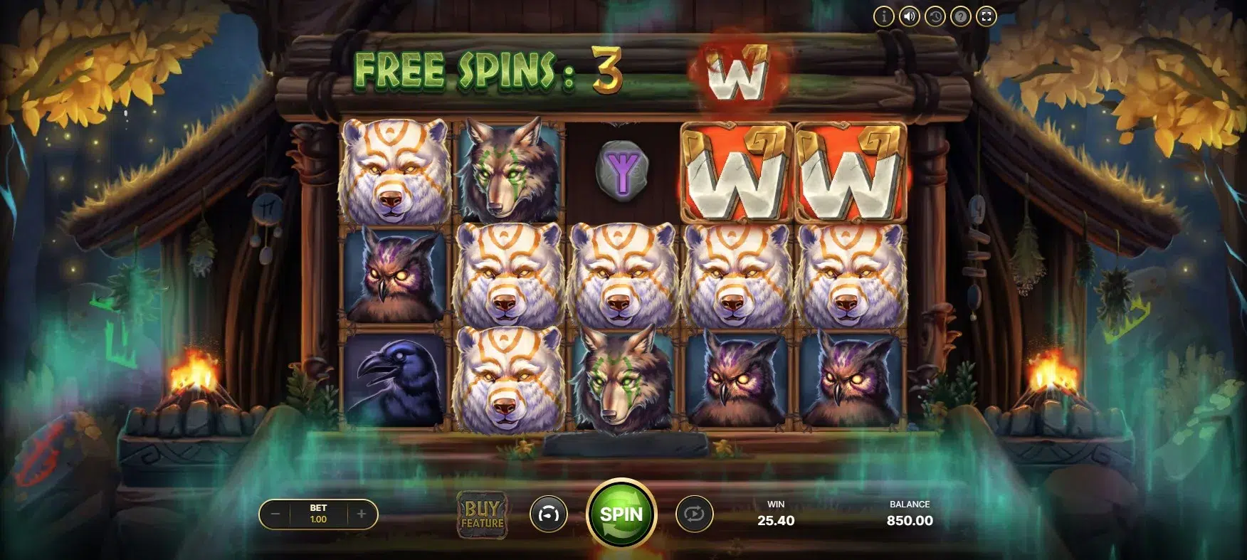 One of Druid’s Magic’s standout qualities is its aesthetic design, which transports players deep into a mystical forest setting. The backdrop is a lush, twilight-lit woodland grove surrounded by mossy rocks, glowing runes, and arcane structures. The opening screen even shows majestic mountain scenery lit by aurora borealis, though the main gameplay takes place within a wooden hut adorned with carved symbols and mystical flora.Symbol design carries the magical theme forward, with low pays represented by glowing rune-inscribed stones in various shapes and colors. High-paying symbols include powerful woodland creatures — ravens, owls, wolves, and bears — all drawn with vivid detail and animation. The wild symbols are dynamic, appearing in five unique styles (more on that shortly), each with a unique flair and presence.