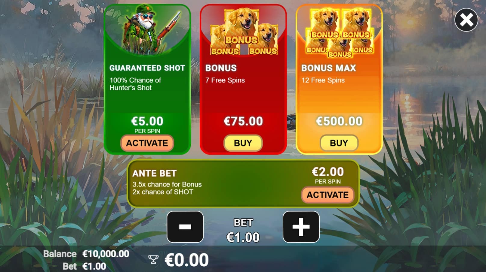 Guaranteed Shot: 5x bet per spin, 100% chance of triggering the Hunter’s Shot.