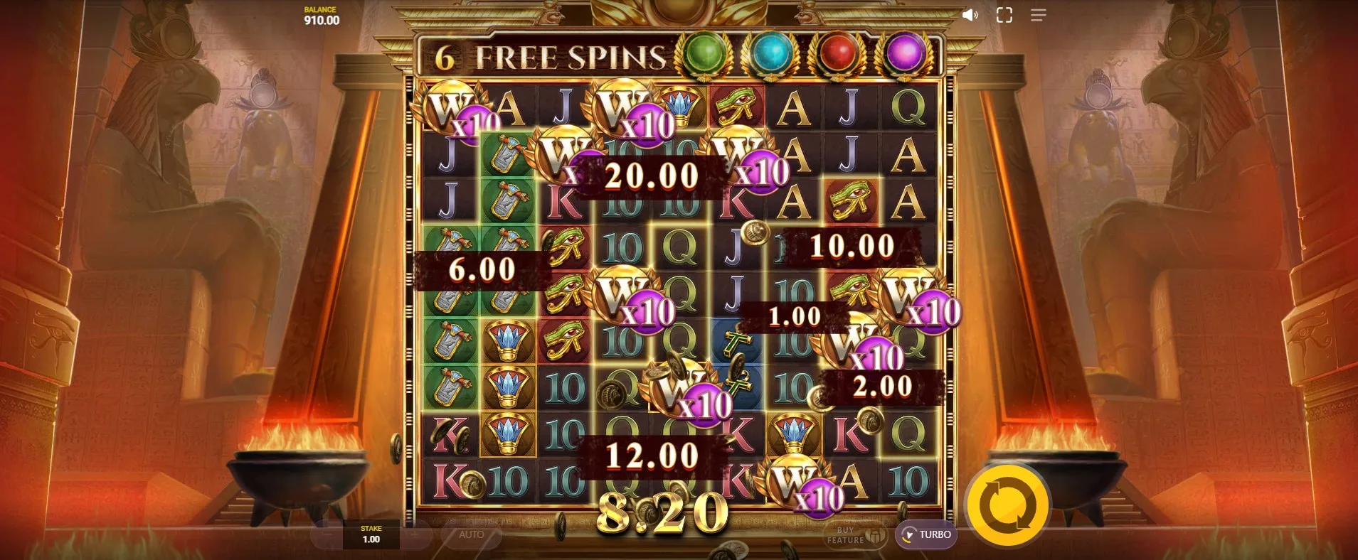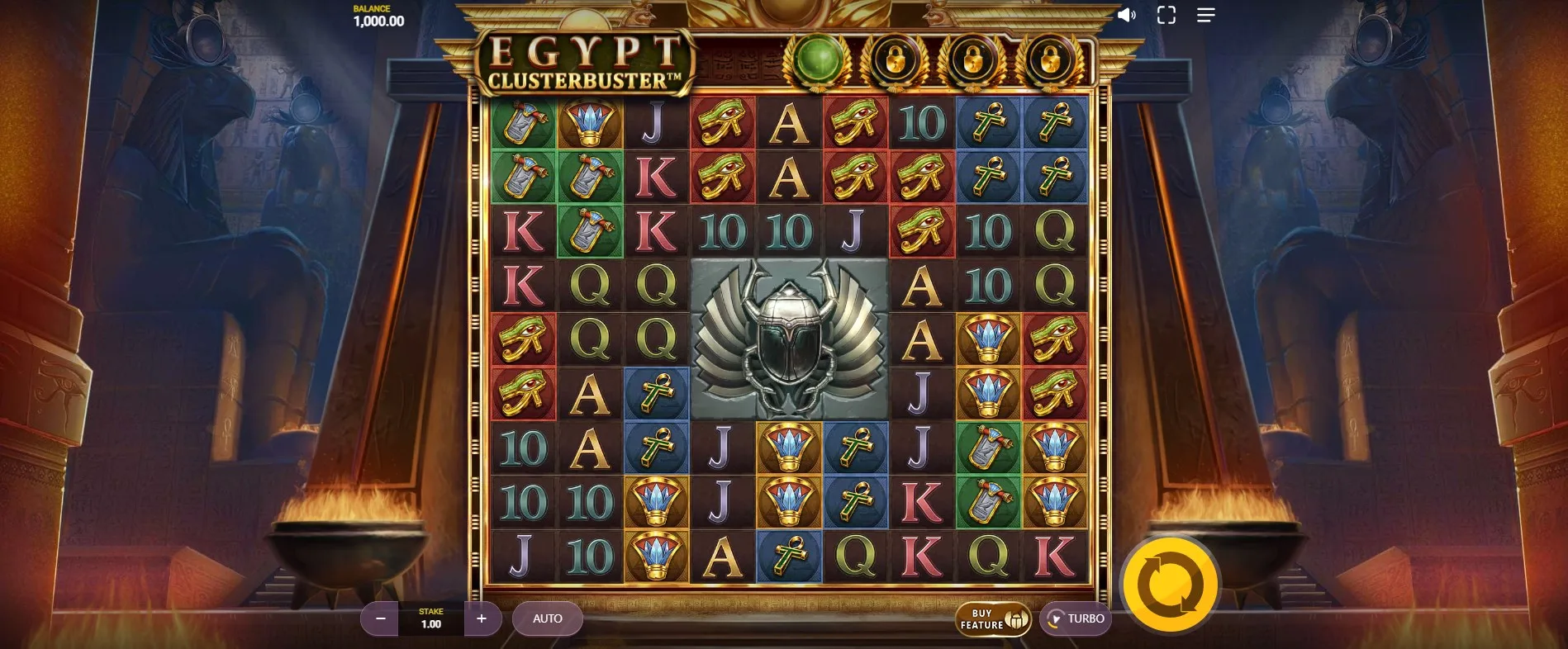 At the core of Egypt Clusterbuster is the cluster pay mechanic, where 5 or more matching symbols connected horizontally or vertically form winning clusters. Standard symbols range from 10–A card ranks (low pays) to traditional Egyptian artifacts like Ankhs, Scarabs, and Pharaoh Masks (high pays). Clusters pay from 0.1x to 50x the bet, depending on size—20+ symbol clusters are the most rewarding.