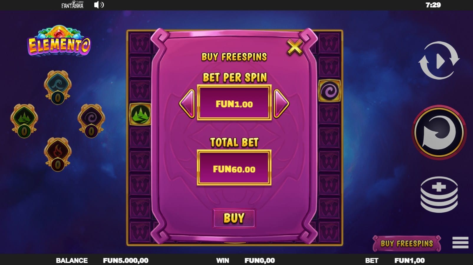 For 60× the bet, you can buy instant entry to the bonus round. Importantly, the feature buy doesn’t skip straight to free spins—you play a special pre-bonus sequence where you collect clusters to activate Element Wilds. This often results in a strong starting win before free spins even begin.