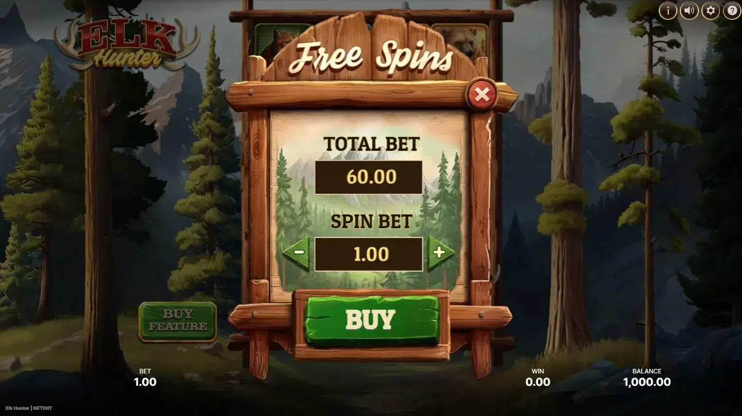 Buy FeatureFor those who prefer to skip straight to the action, Elk Hunter offers a Bonus Buy option that activates the Free Spins round instantly for 60x the stake. This is slightly above industry average for this kind of feature but may appeal to impatient players looking to test bonus volatility.