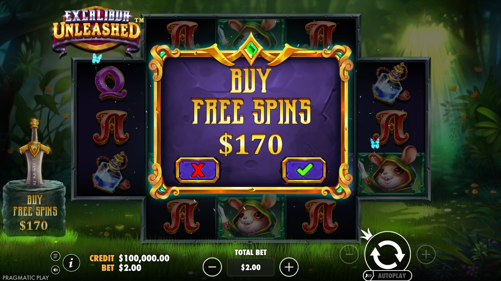 Excalibur Unleashed boasts a vibrant, cartoonish aesthetic set in an enchanted forest backdrop, evoking a sense of whimsy and adventure. Lush green grass sways gently, interspersed with animated butterflies and rabbits that dart across the screen, adding life to the scene. Sunlight filters through dense, leafy trees in the upper right, casting a magical glow, while the iconic Excalibur sword protrudes from a moss-covered stone to the left of the reels. This stone doubles as an interactive Bonus Buy button, seamlessly blending narrative and functionality.