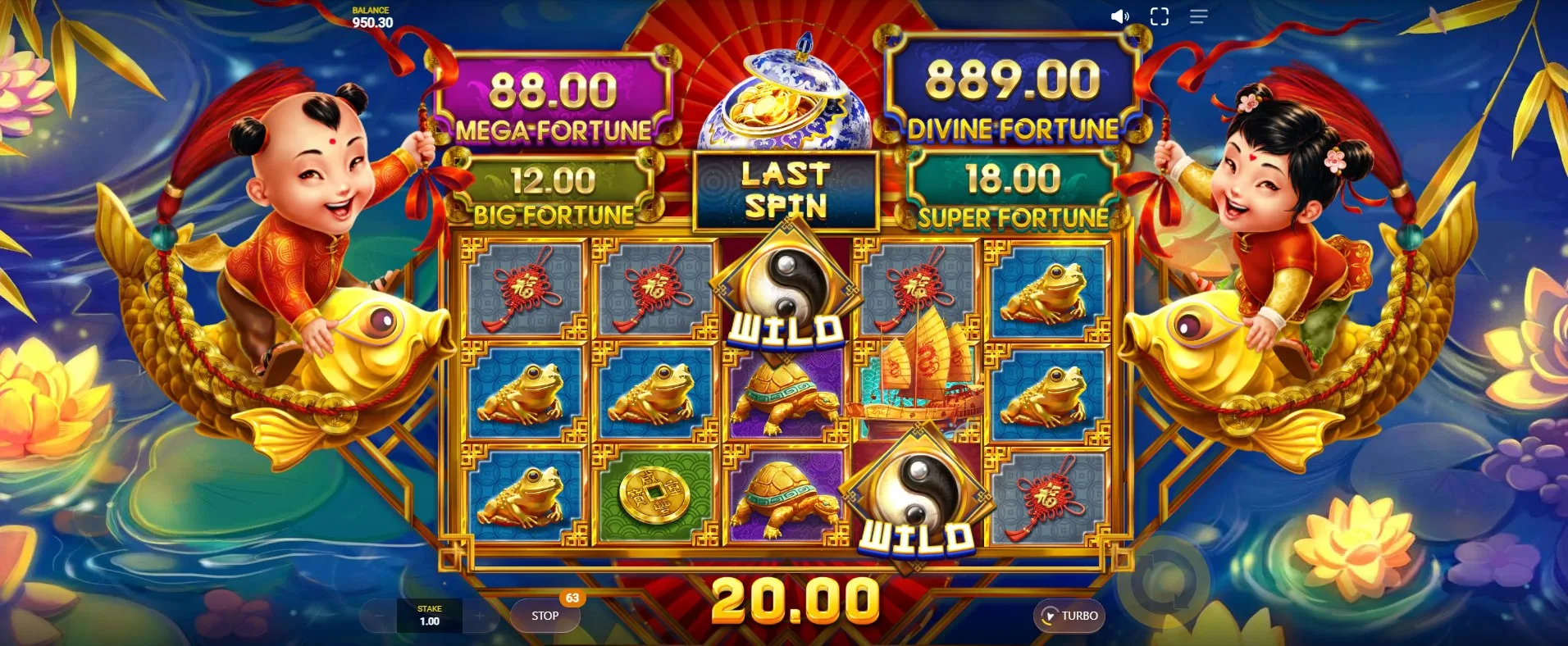 Fa Fa Babies 2 is undeniably rich in visual charm. The action plays out over a stylized golden gaming grid suspended above a koi-filled water garden, with lotus leaves and lucky envelopes drifting peacefully below. The centerpiece is flanked by two adorable Fa Fa Babies, animated in exaggerated, cheerful expressions as they ride on fish and play amongst golden coins and fireworks. Above the reels float four Fortune Prize values—color-coded (Big, Super, Mega, and Divine Fortune)—adding further visual intrigue. These prizes are linked to Lucky Envelope mechanics and provide a tangible display of progression as you play.