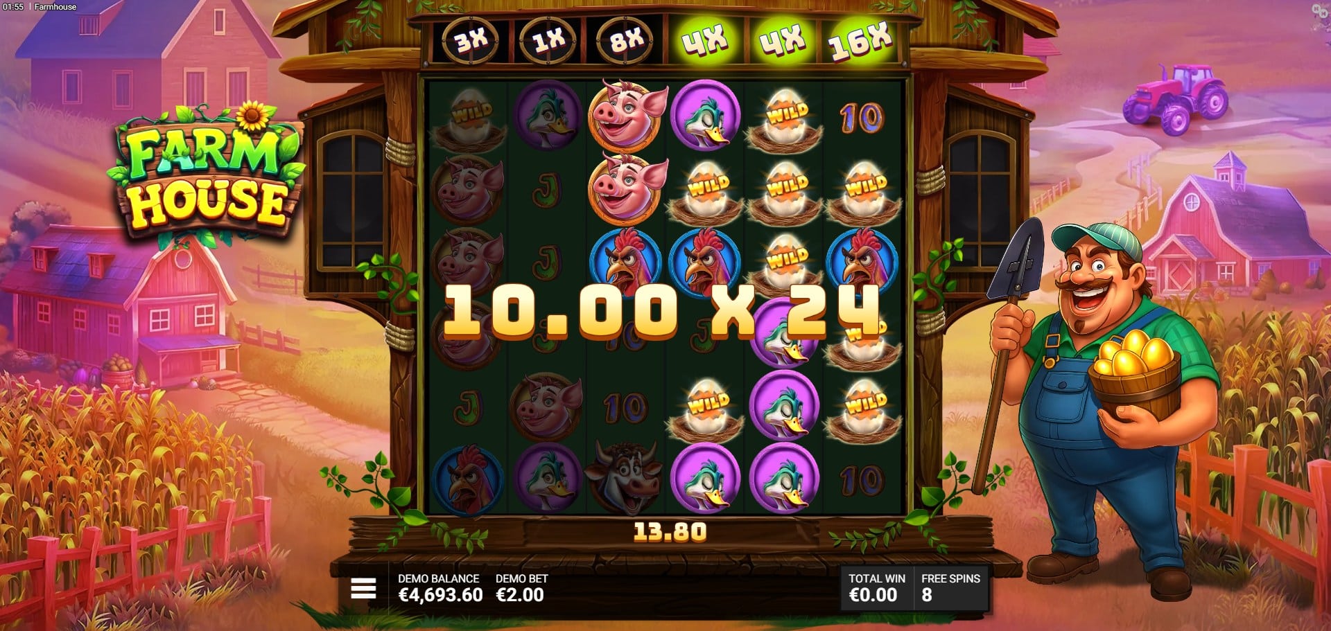 Farmhouse packs several interconnected features centered on Wilds, Eggs, and cascades, amplifying win potential through multipliers.