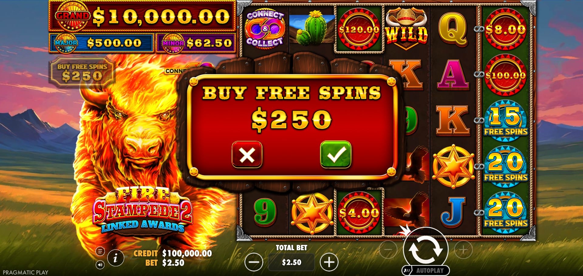 Thematically, the game shifts from rocky desert canyons to grassy plains dotted with distant mountains, but the core idea remains instantly recognizable. The action still revolves around creating symbol chains that snake their way across the grid to reach special prize positions, triggering a burst of possible rewards. And while the connective gameplay was already unique on release, Fire Stampede 2 Linked Awards builds upon it with new mechanics, expanded payout ceilings, and a little more volatility.