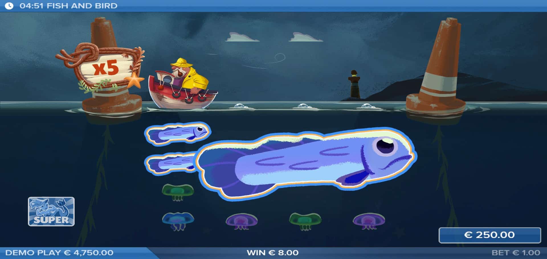 These oversized symbols burst onto the board with comedic exaggeration, especially when combined with spreading wilds. Character animations, including the fisherman’s boat drifting or the birds swooping overhead, add delightful personality to the screen without overwhelming the compact grid.