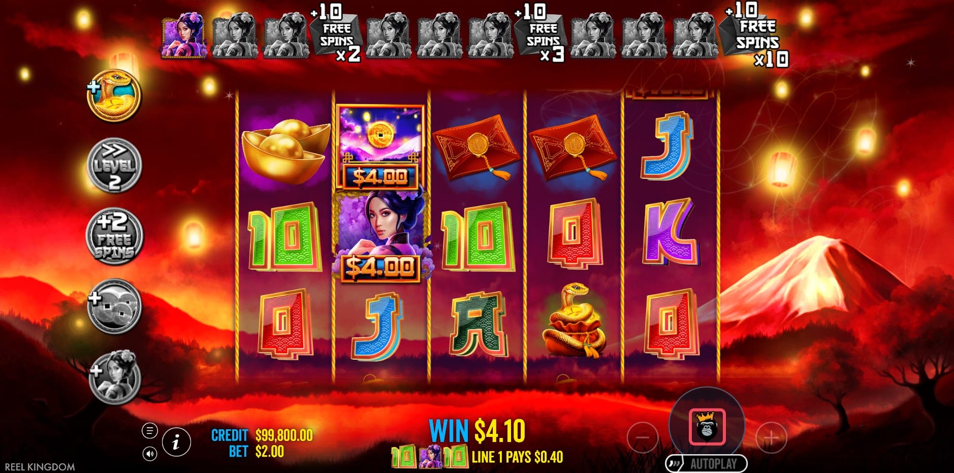 Floating Dragon Year of the Snake employs a straightforward 5-reel, 3-row layout with 10 fixed paylines. Wins form by landing 3 or more matching symbols (2 or more for the top-paying golden snake) on a payline, starting from the leftmost reel and continuing on adjacent reels. The base game flows with standard spins, where winning symbols contribute to payouts before any special interactions, though Money Symbols can form line wins up to 20x the bet for five-of-a-kind despite their primary bonus role.