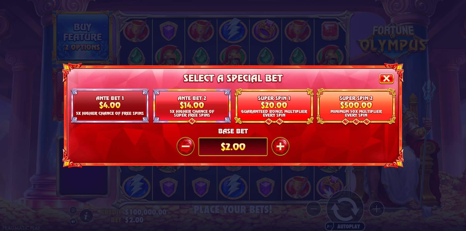 | Ante Bet 2 | 7x | 5x higher Super Free Spins chance (min 5x multipliers) |