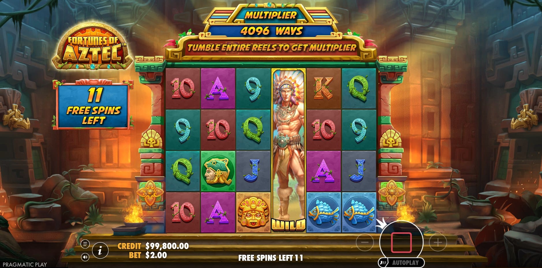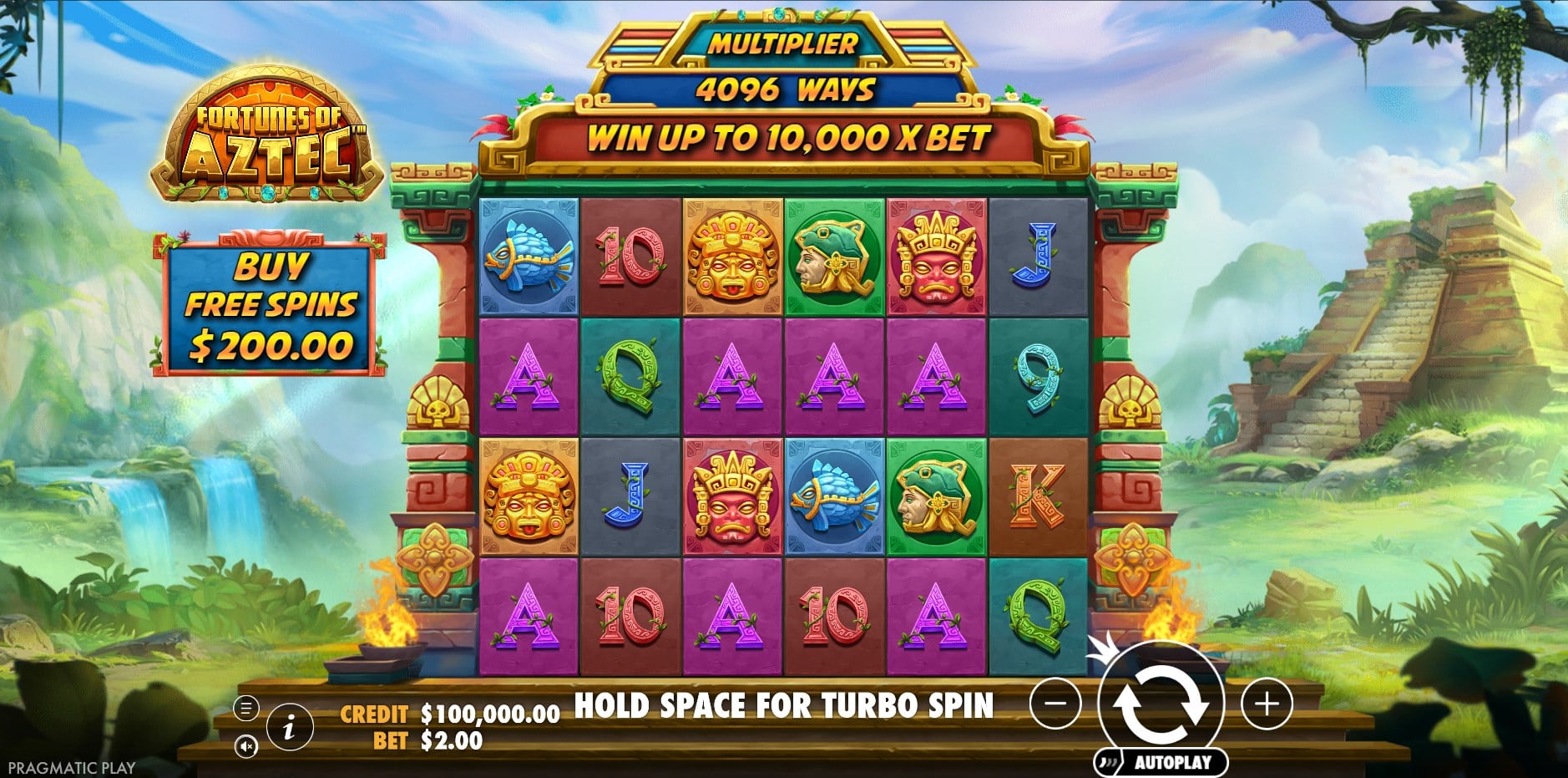 Fortunes of the Aztec is a Mesoamerican-themed video slot developed by Pragmatic Play and released on September 14, 2023. The game immerses players in an ancient Aztec jungle setting featuring pyramids, face masks, and antique artifacts amid mountains and waterfalls. It employs a 6-reel, 4-row grid with 4,096 ways to win, utilizing a cascading mechanic known as the Tumble Feature that allows multiple wins per spin. Targeted at enthusiasts of high-volatility slots seeking substantial payout potential up to a 10,000x max win, it offers engaging base game action enhanced by progressive multipliers and a robust Free Spins round.