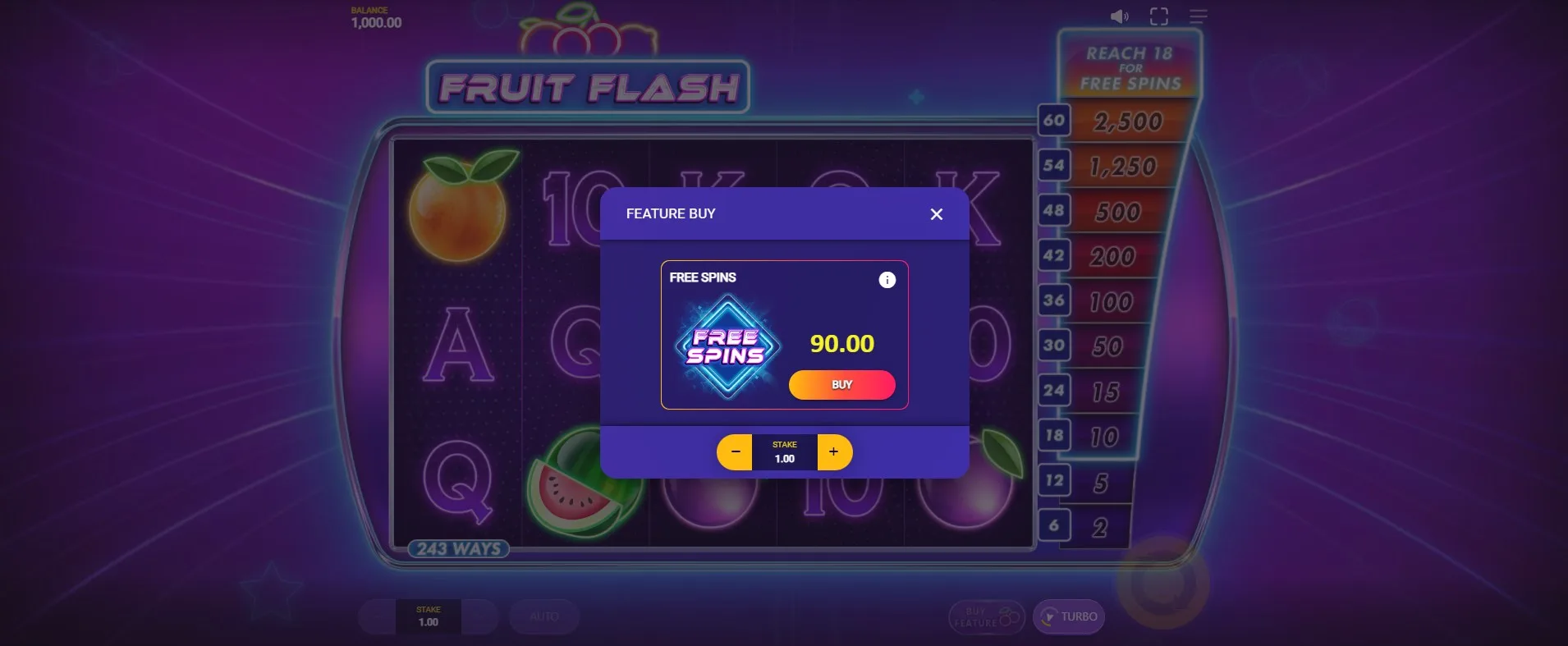 Feature Buy For 90x your stake, you can buy into the free spins with 18 symbols guaranteed.