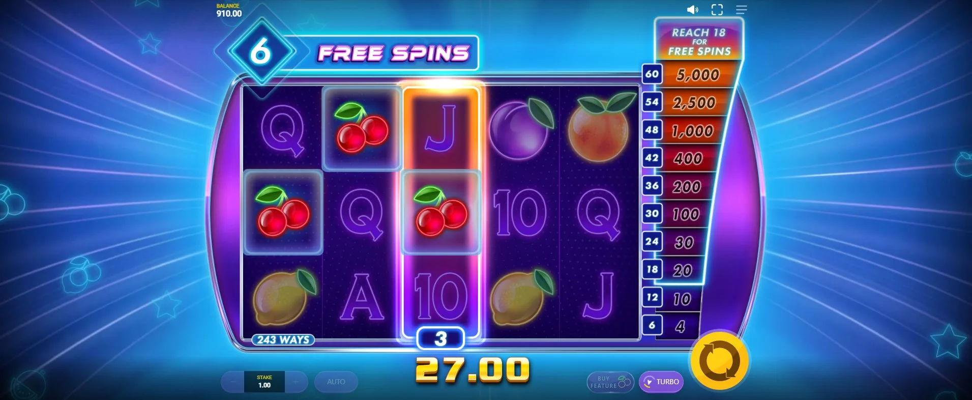Fruit Flash uses a 5-reel, 3-row layout with 243 ways to win, meaning all adjacent matching symbols from left to right starting from reel 1 trigger a win, regardless of row alignment. What makes the gameplay distinct is the Win Frame and Prize Ladder combination. At the beginning of each spin, the center position on the middle reel is marked as the Win Frame. If a winning symbol passes through this position, it’s collected and added to a tally. Once collected, the game triggers a respin, and the Win Frame expands to cover the full center reel.