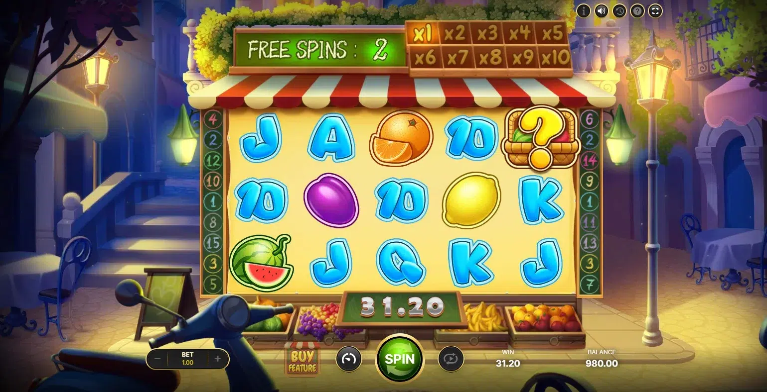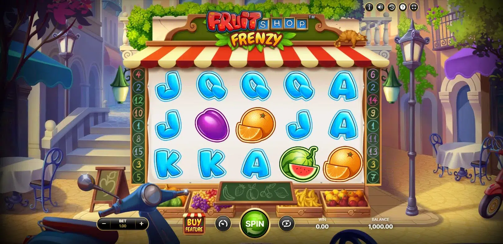 Fruit Shop Frenzy paints a picturesque setting straight out of a southern European summer day. The game grid is tucked inside an inviting street-side fruit stand, complete with a red-and-white canopy, cobblestone streets, and café tables flanked by lantern-lit walkways. Whether it evokes a tranquil alley in Italy or a sun-drenched plaza in Spain, the ambiance is warm, cheerful, and full of charm. The slot grid is compact and classic—5 reels, 3 rows, and 15 paylines—but the design shines through its richly illustrated symbols and vibrant color palette. Card symbols from 10 to A are frozen in candy-blue hues, while premium fruits such as cherries, plums, lemons, oranges, and watermelons are rendered with a cartoony gloss and visual punch. Add to that smooth animations, a stylish Fruit Shop Frenzy logo wild, and neatly integrated interface elements, and you’ve got a slot that feels cozy, crisp, and inviting.