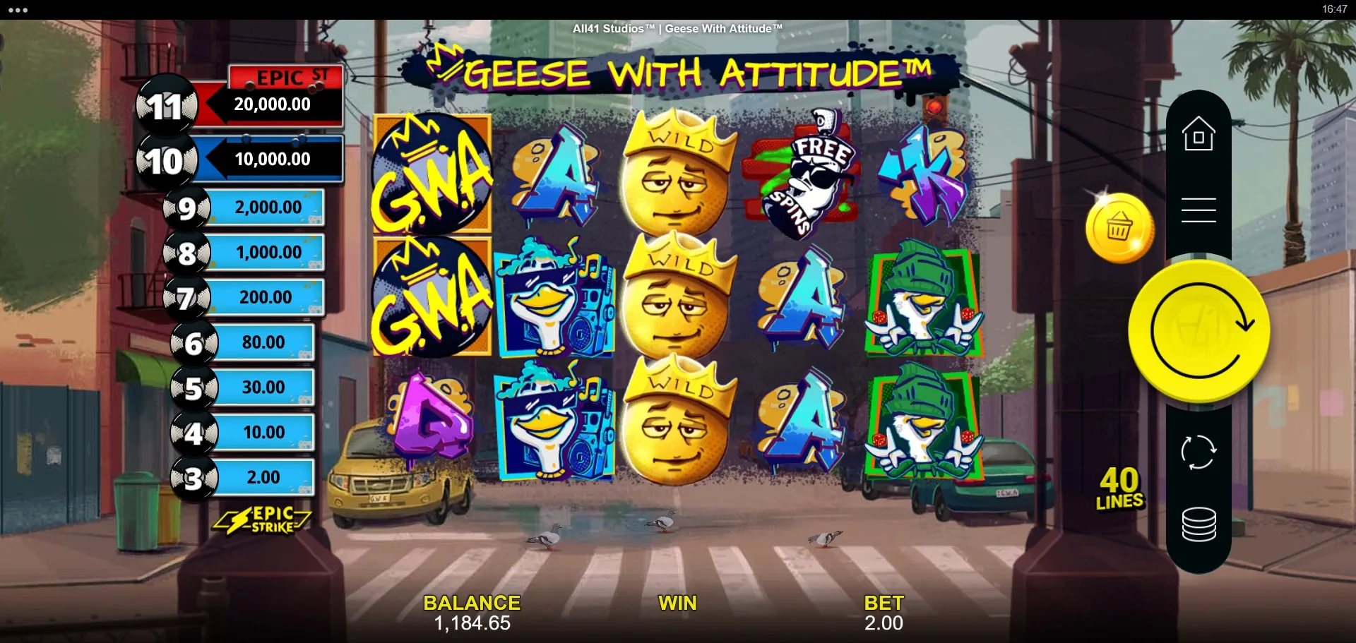 Geese With Attitude caters to a wide range of players with a stake range from €0.25 to €25 per spin. This makes it accessible for casual players while still appealing to high rollers who appreciate the high volatility and significant win potential.