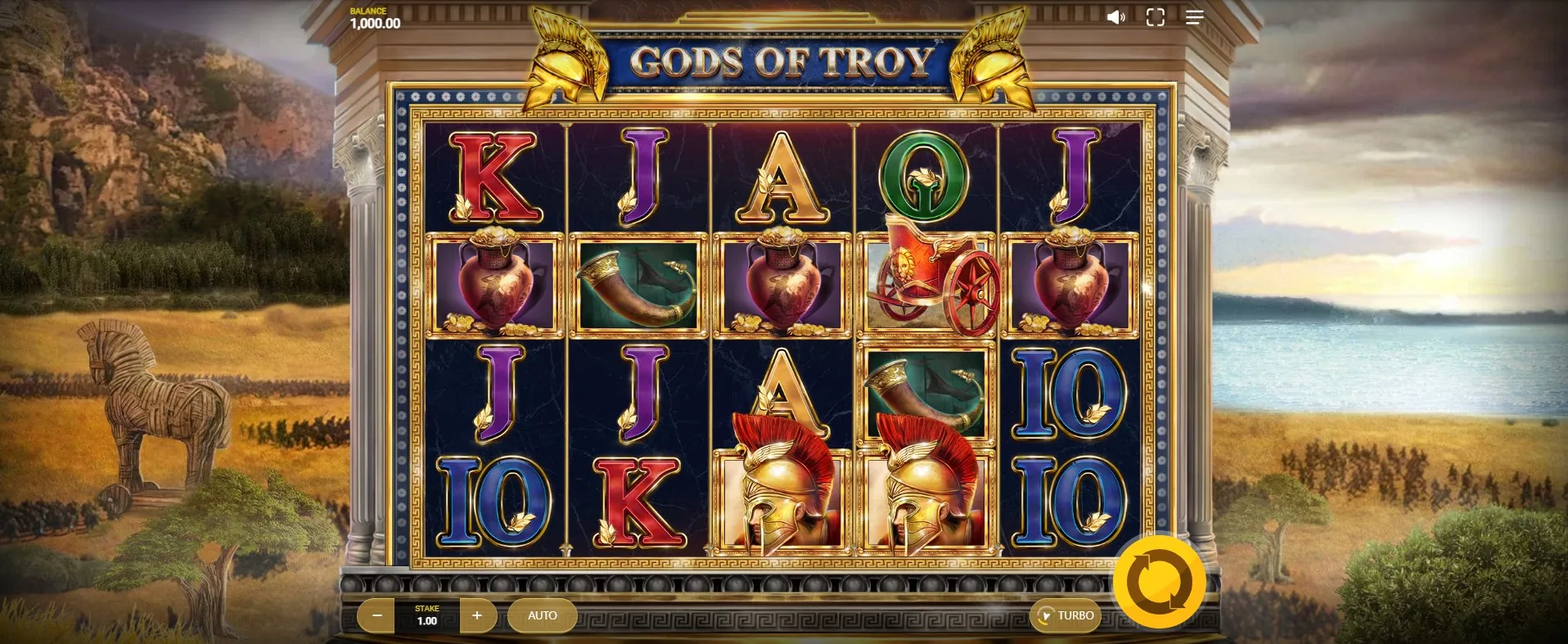 In Troy Spins, Wilds are added at random positions on every spin — removing the need for the spin cycle mechanic during the bonus round. These Wilds can stack impressively thanks to multipliers.