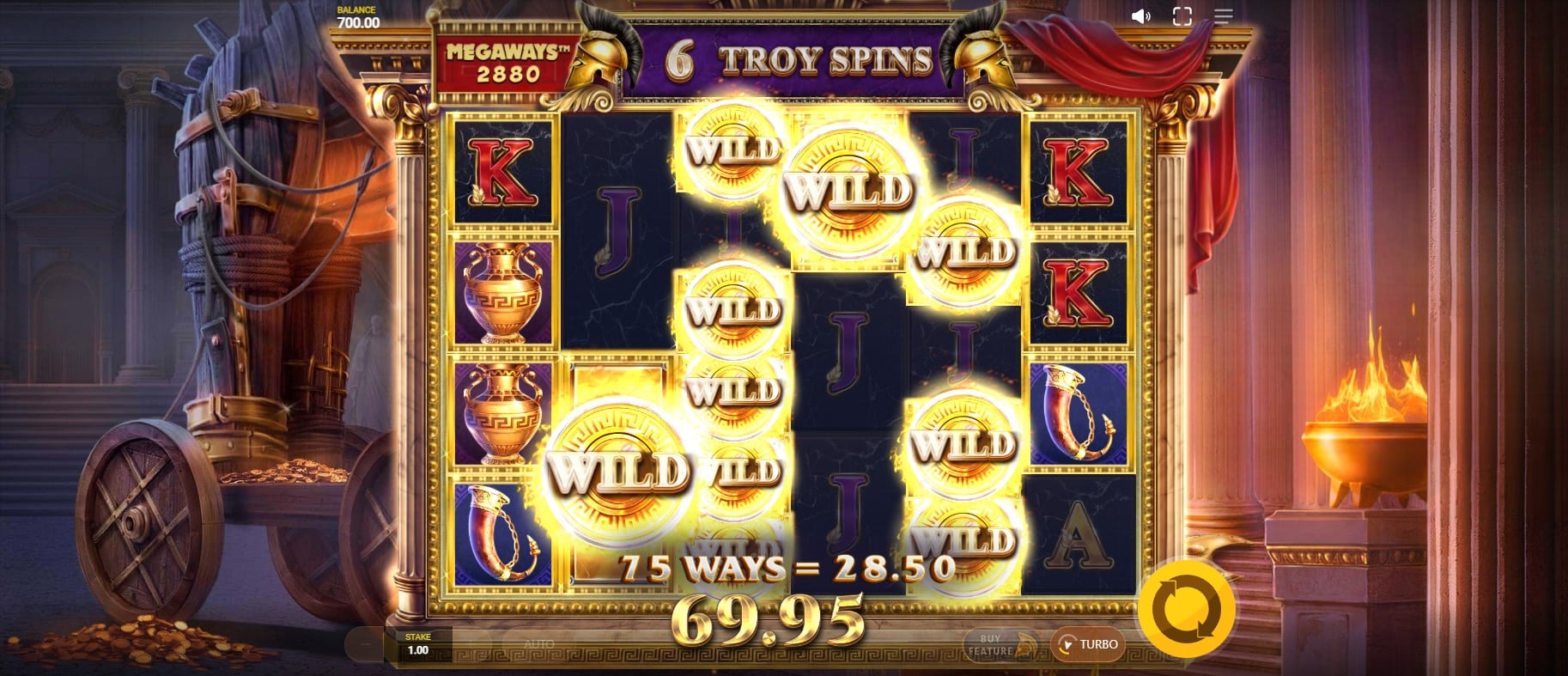In Troy Spins, Wilds are added at random positions on every spin — removing the need for the spin cycle mechanic during the bonus round. These Wilds can stack impressively thanks to multipliers.