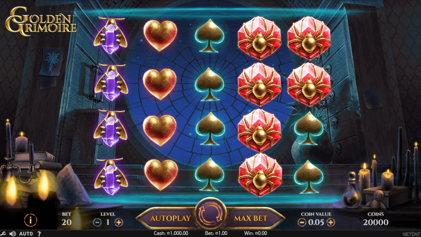 NetEnt is well-known for its visual prowess, and Golden Grimoire is no exception. Set within an elaborately detailed sorcerer’s chamber, the game oozes gothic charm and magical allure. Flickering candles, ancient alchemical tools, and occult inscriptions form a richly animated background that complements the slot’s mysterious theme.Symbols are split between traditional suits—hearts, diamonds, clubs, and spades—and themed images such as snakes, beetles, cephalopod mollusks, and spiders gripping gems. The top-paying symbol, the spider, only pays 1x your stake for five of a kind, which speaks volumes about the game’s conservative payout structure.