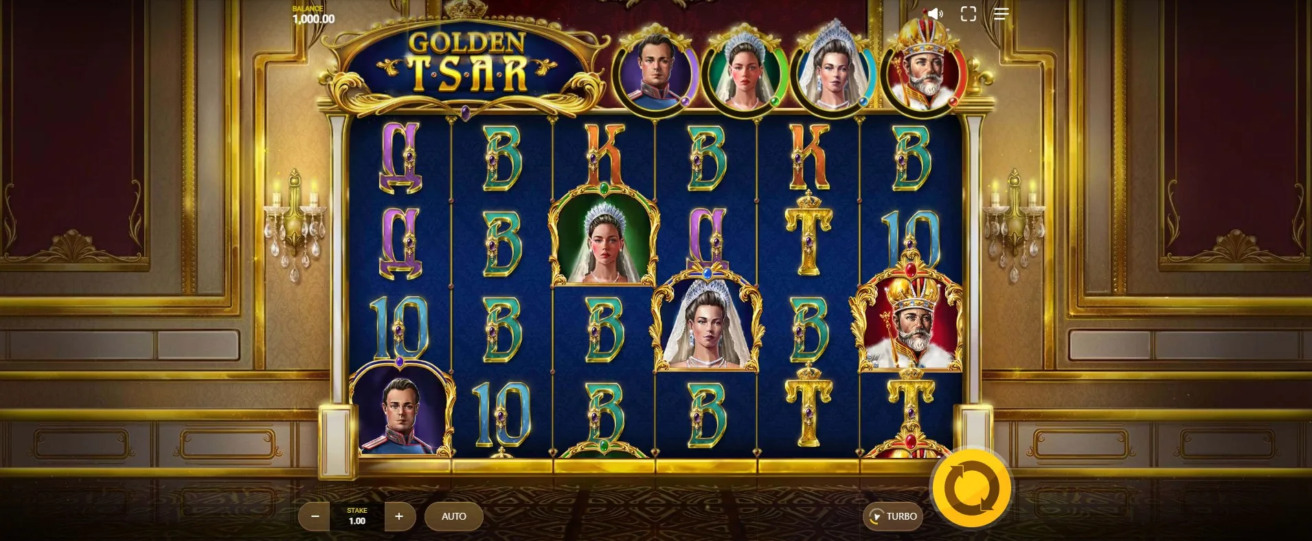 Golden Tsar is a masterclass in aristocratic theming. The slot screen is set within a majestic golden ballroom — a scene of elite refinement, complete with chandeliers, polished floors, and regal red drapes. The reels are flanked by gold-trimmed pillars and subtle candle sconces that illuminate the surroundings with a dignified glow. The interface is minimal, allowing the artwork and animations to dominate the experience. The reel symbols further echo this theme. Low-paying symbols are designed as Cyrillic-style 10, J, Q, K, and A characters, cleverly replacing the standard deck values with a regional touch. Premium symbols include a lineup of royal family members: the Tsar, Tsarina, Princess, and Prince. These are finely illustrated portraits wearing jewels, robes, and regal expressions, reinforcing the aristocratic fantasy.