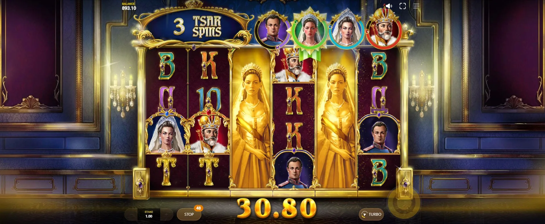 It’s possible to have all four premium symbols expanded during Tsar Spins, creating huge potential for big hits.