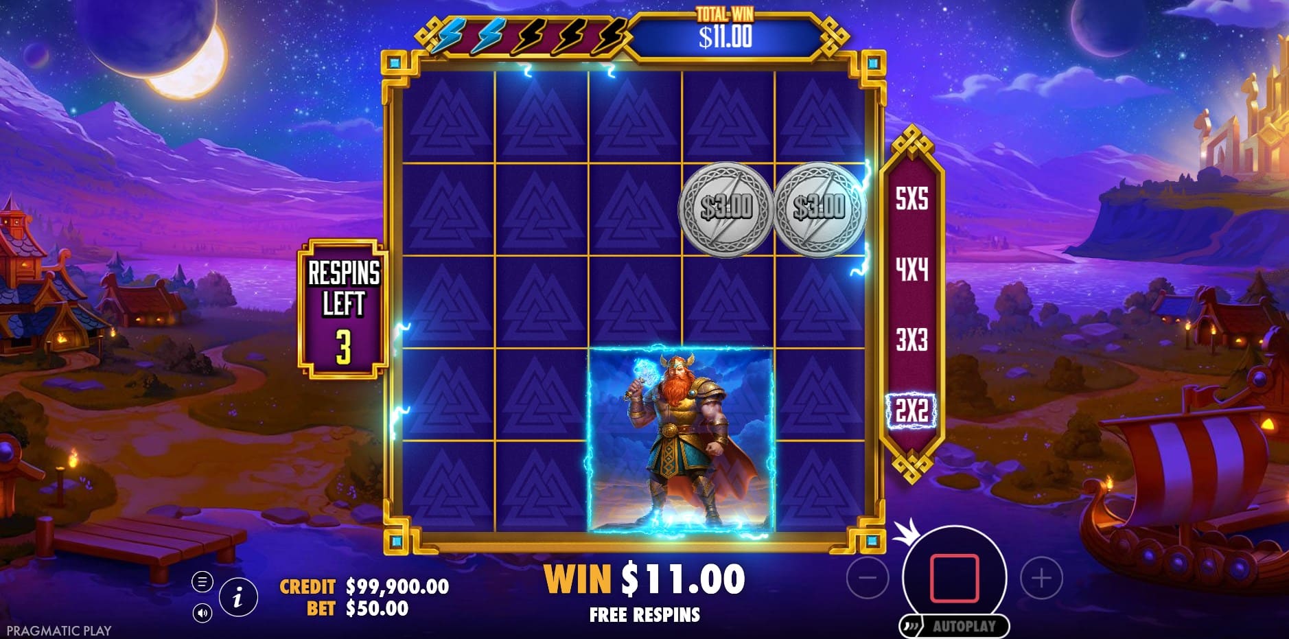 Hammerstorm’s primary attraction is its Respins feature, a Hold & Win-style bonus with unique twists, triggered by landing Thor Scatter with Lightning symbols or by filling Lightning meters via collections. It initiates on an expanded 5×5 grid (up to 7×7 with modifiers) with 5 respins, where only blanks, Coins, and Lightning symbols land. A roaming 2×2 collection zone starts randomly and relocates per spin, growing as Lightning charges fill its meter: +3 spins for the first three fills, then +2, +1 thereafter, maxing at 5×5 (or 7×6 with Expand).