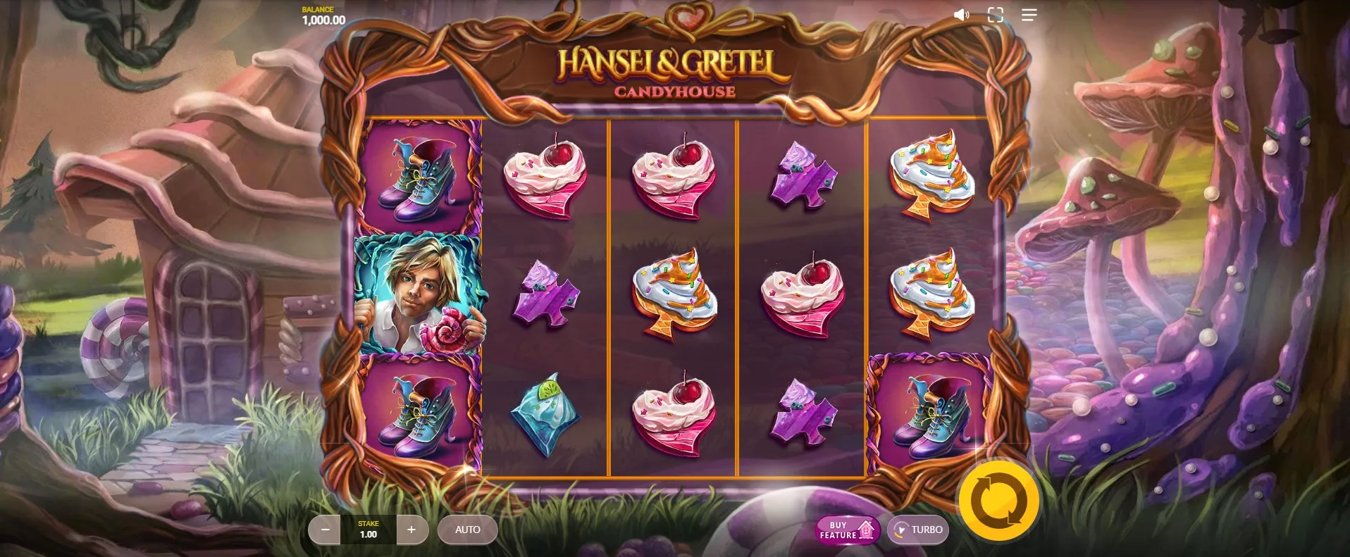 Hansel & Gretel Candyhouse operates on a 5×3 grid with 25 fixed paylines. Wins are made by landing three or more matching symbols across paylines from left to right. The slot introduces an original mechanic called Sibling Reels, which adds a synced reel twist to the gameplay.