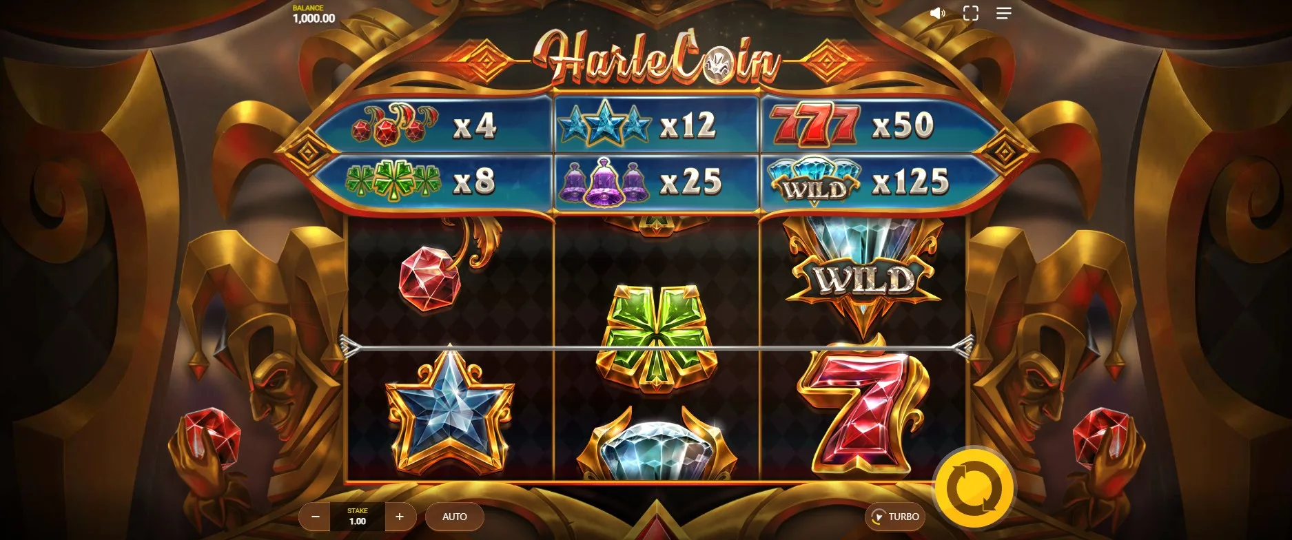 The twist lies in the HarleCoin feature. Coins may land on top of symbols at any time. When they do, they increase the payout value of that symbol type, displayed on the panel above the reels. When you land a winning combination, the value of that symbol at that moment is awarded. After that, the value resets to a new amount ranging between 1x and 30x the bet (or higher when boosted further).
