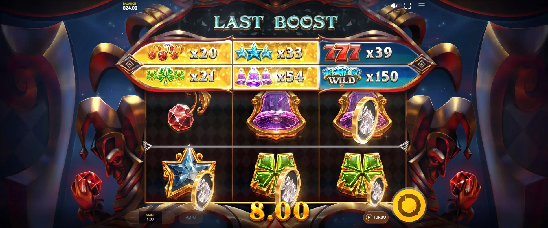 Landing 3 bonus symbols on the single payline awards up to 25 Boost Spins. The exact number is randomly determined. During Boost Spins:All symbols (except bonus symbols) land with a HarleCoin, guaranteeing a value boost.