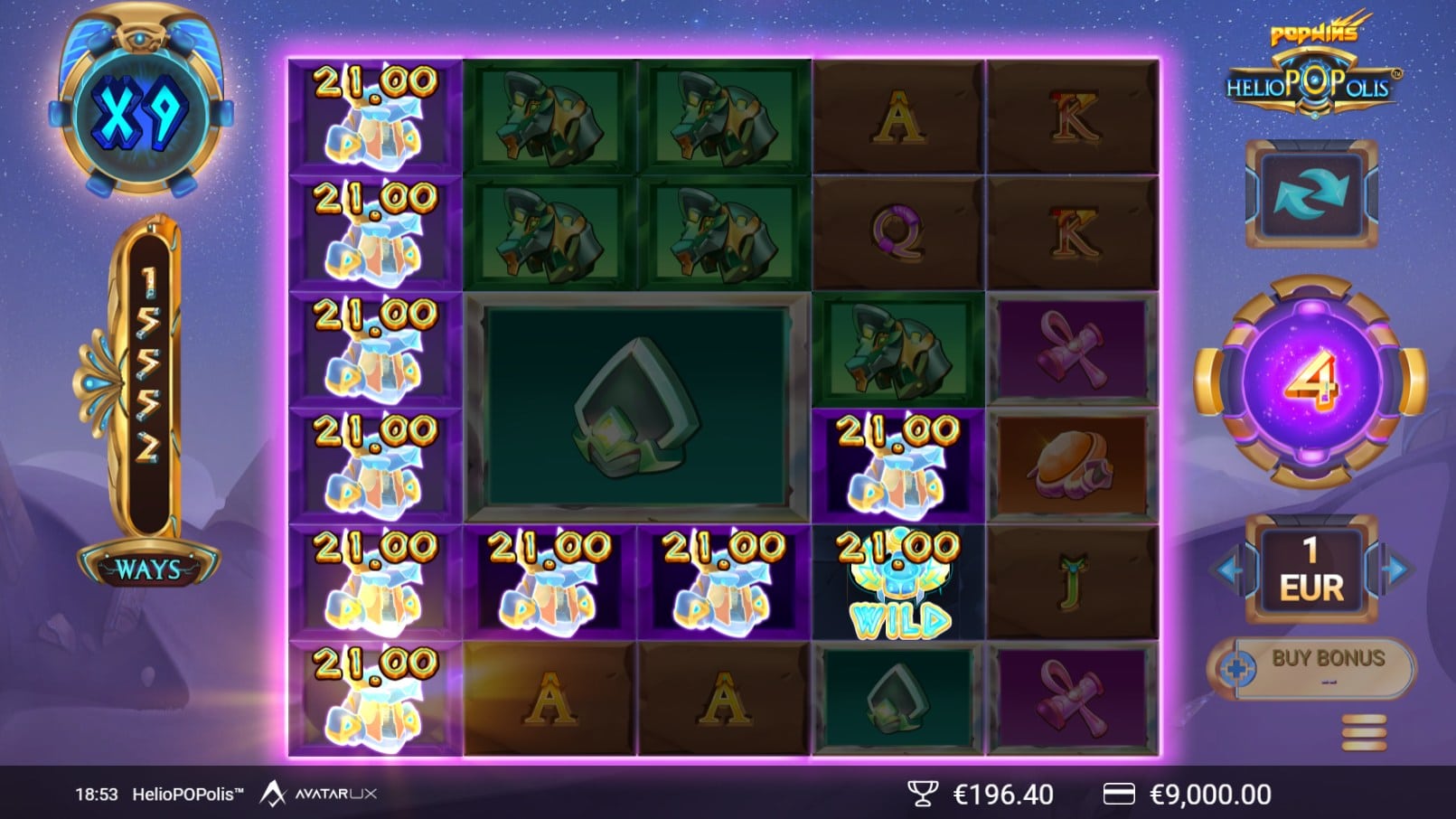 The maximum payout is an impressive 20,000x the bet, putting HelioPOPolis on par with other big-win PopWins slots. Achieving this requires chaining wins with maximum reel expansion, synced reels, and rising multipliers — a rare but thrilling prospect.