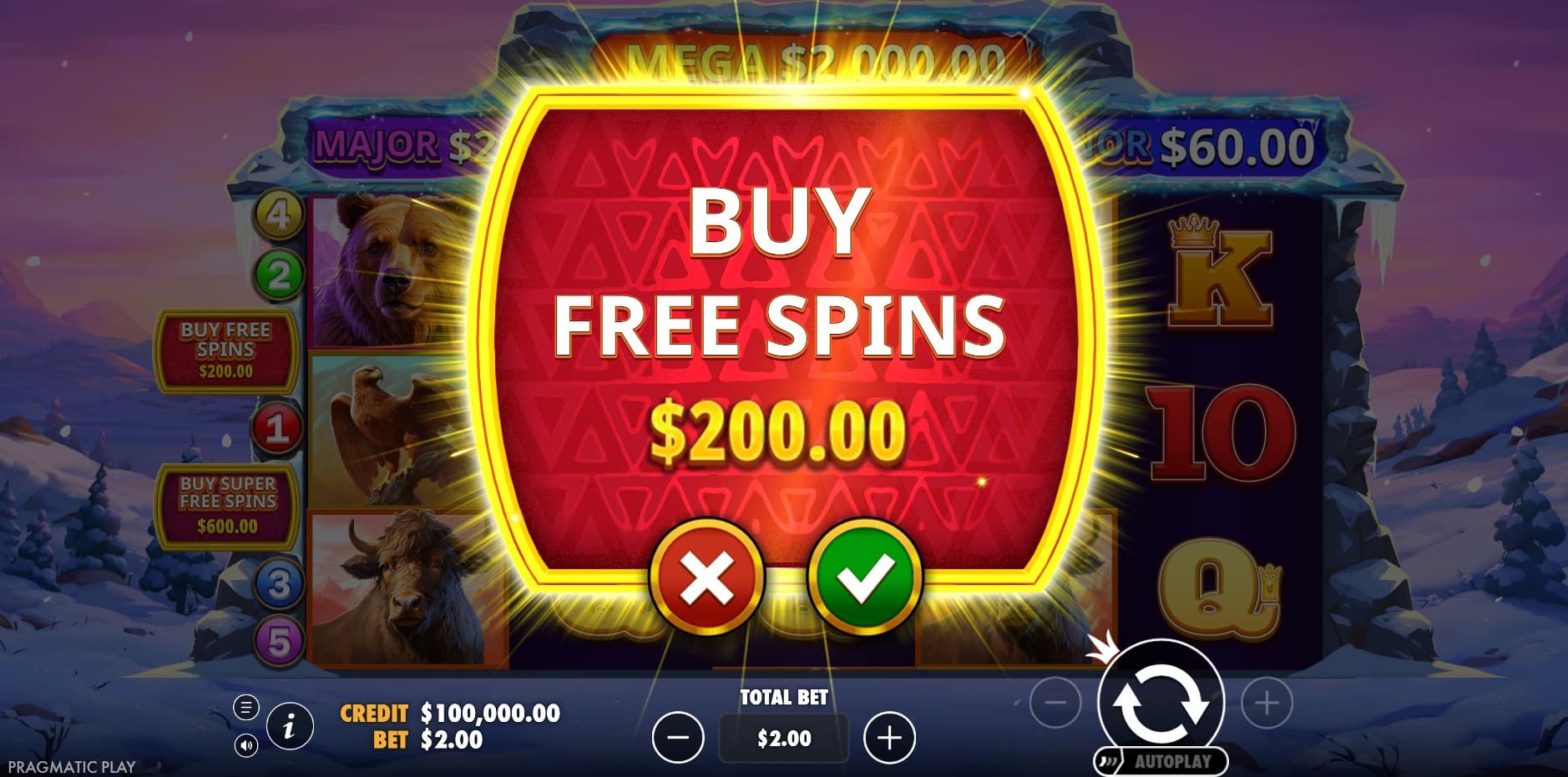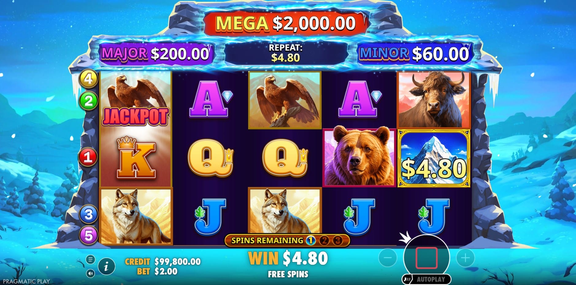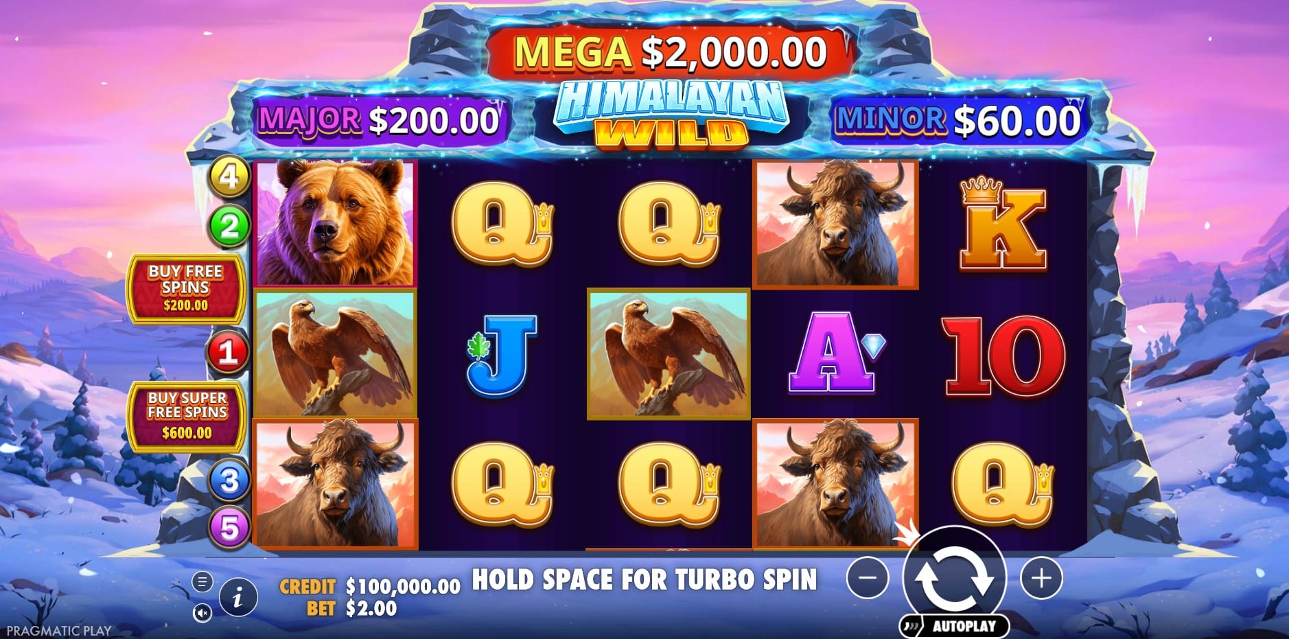 Himalayan Wild is a mountain adventure-themed slot developed by Pragmatic Play and released in 2024. The game transports players to the snowy peaks of the Himalayas, featuring majestic Asian wildlife such as eagles, wolves, oxen, and bears amidst a rugged winter landscape. It employs a classic gameplay style with 5 reels, 3 rows, and 5 paylines, where wins form by landing matching symbols from left to right. Targeted at fans of high-volatility slots with jackpot potential, it offers an engaging mix of base game wins and feature-driven excitement, culminating in a 10,000x max win potential.