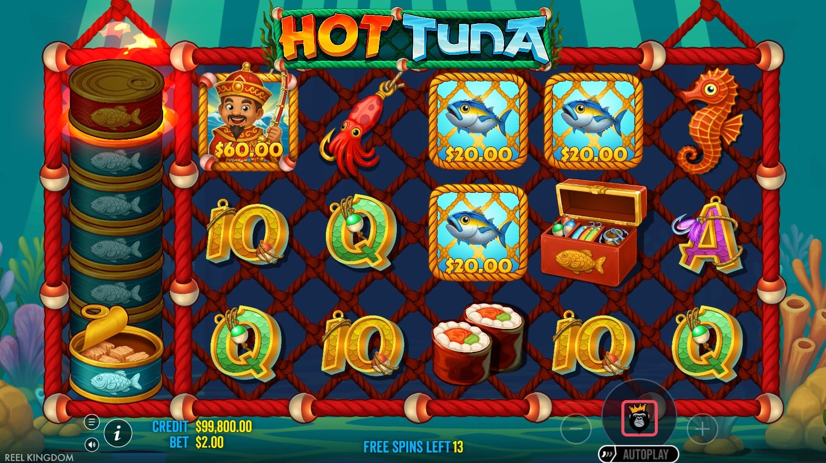 Hot Tuna is a fishing-themed video slot developed by Reel Kingdom, released on January 12, 2026. The game immerses players in a deep-sea adventure with an East Asian aesthetic, featuring a cheerful fisherman on a small boat amid oceanic visuals and giant tuna fish capable of reaching speeds up to 70 km/h. It employs a classic 5×3 reel layout with 10 fixed paylines, where wins form by landing three or more matching symbols on adjacent reels starting from the leftmost reel. Gameplay revolves around collecting Money Symbols during Free Spins, enhanced by a unique Tuna Meter mechanic. With high volatility, a hit frequency of 13.97%, and a maximum win potential of 2,500x the stake, Hot Tuna targets enthusiasts of fishing-themed slots like Big Bass Bonanza and Big Bass Mission Fishin, who appreciate straightforward base game action leading to feature-rich bonus rounds.
