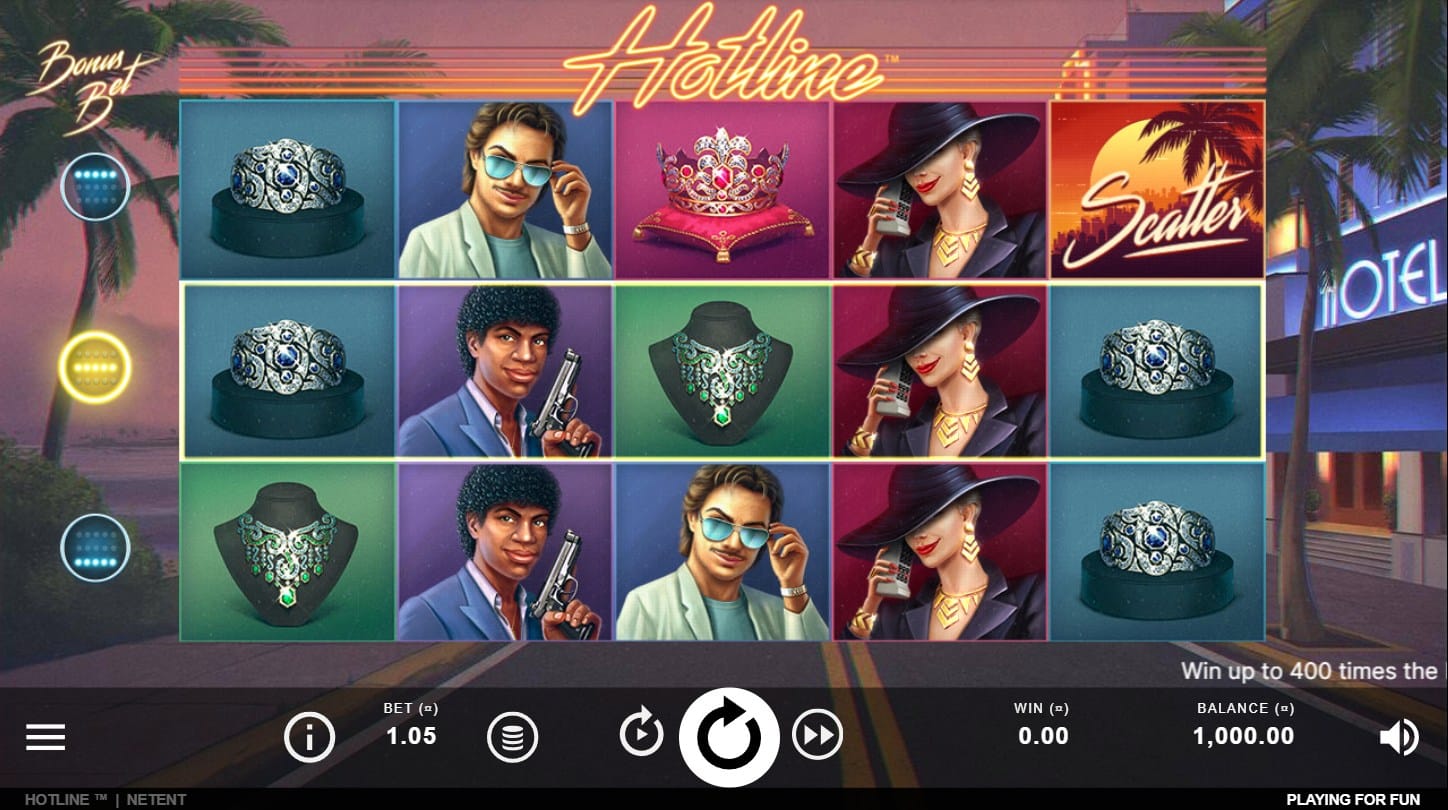 Hotline is a slot game developed by NetEnt, featuring a 5-reel, 3-row grid with 30 fixed paylines. Released out now, it draws inspiration from the neon-soaked 1980s aesthetic, specifically evoking the cult-classic TV show Miami Vice through its glitzy visuals, synth-laden soundtrack, and classic cop-versus-criminal storyline. The game introduces the innovative Hotline Bonus Bet system, allowing players to activate one, two, or three hotlines—special rows that enhance volatility and win potential by enabling Expanding Wilds and Re-Spins. This blends nostalgic retro styling with modern, player-controlled gameplay mechanics.