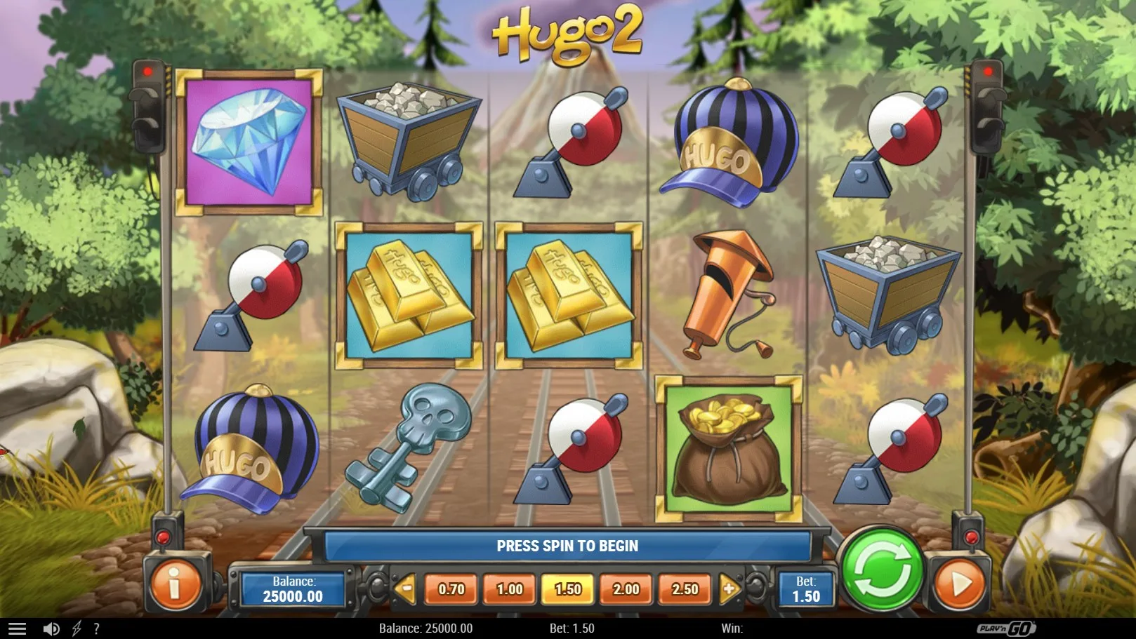 Hugo 2 maintains a bright and colorful aesthetic, in line with the character’s origins from the 1990s Danish TV show and video game series. The game’s cartoonish charm is evident in its backdrop, featuring rail tracks leading into a mysterious mine, suggesting a high-speed adventure. The reels are set against a lively forest and mountain landscape, keeping the atmosphere fun and lighthearted.