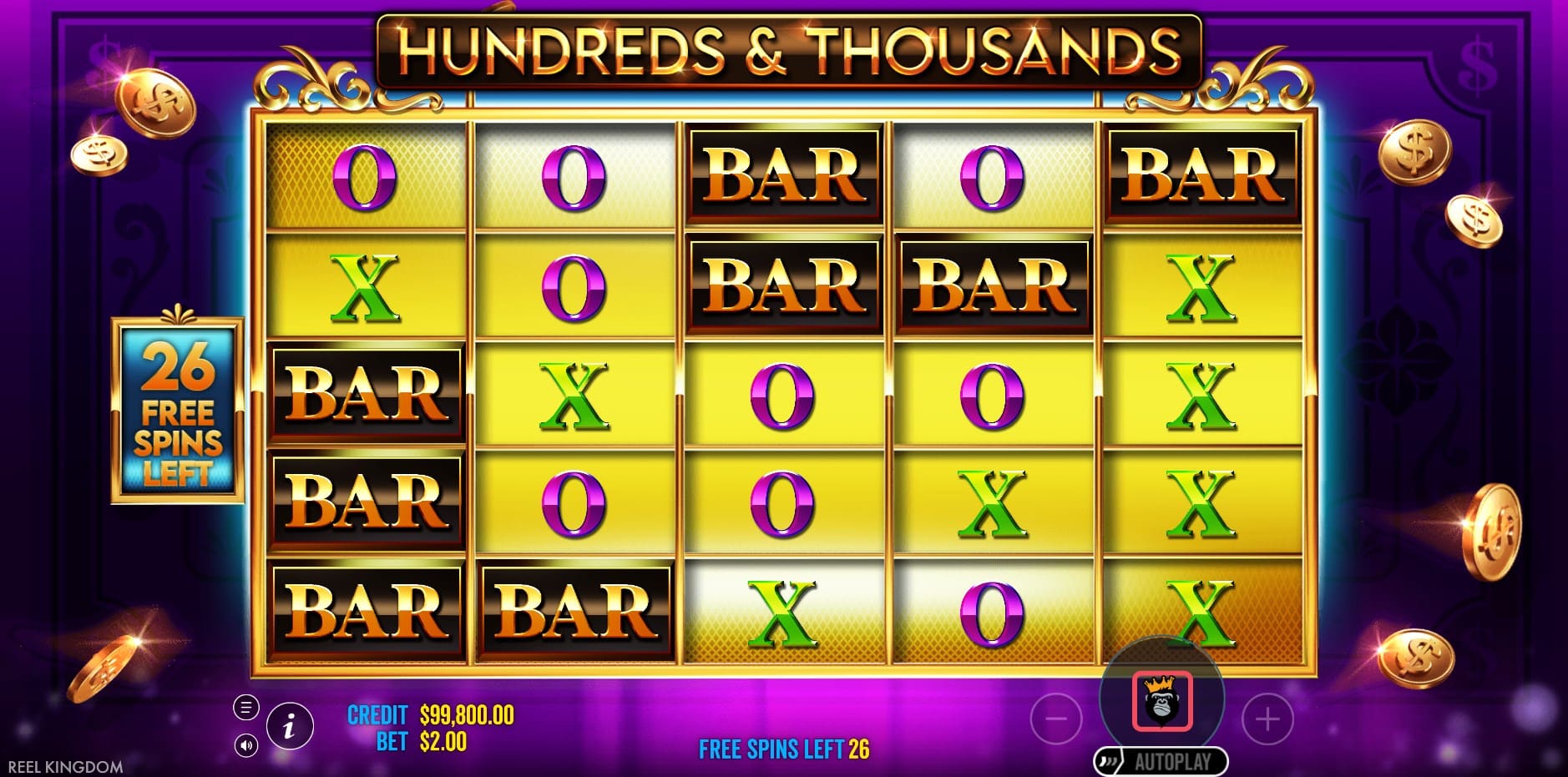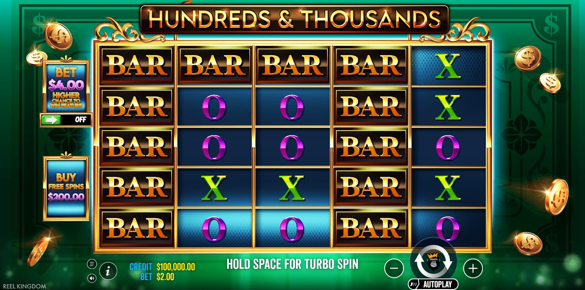 The visual aesthetic of Hundreds and Thousands revolves around a vibrant money theme, dominated by a green dollar bill as the background, which immerses players in a wealth-oriented atmosphere. At the center sits the 5×5 game grid framed in gold, evoking an exclusive, premium feel that contrasts with the simplicity of its mechanics. Symbols are crisply rendered with a classic casino flair: the high-paying BAR symbol gleams with metallic accents, while the X symbol adopts a bold, geometric design. Lower elements include a purple 0 representing a blank non-paying symbol, and the Scatter depicted as a dollar bill emblazoned with “Free Spins” text, which stands out prominently.