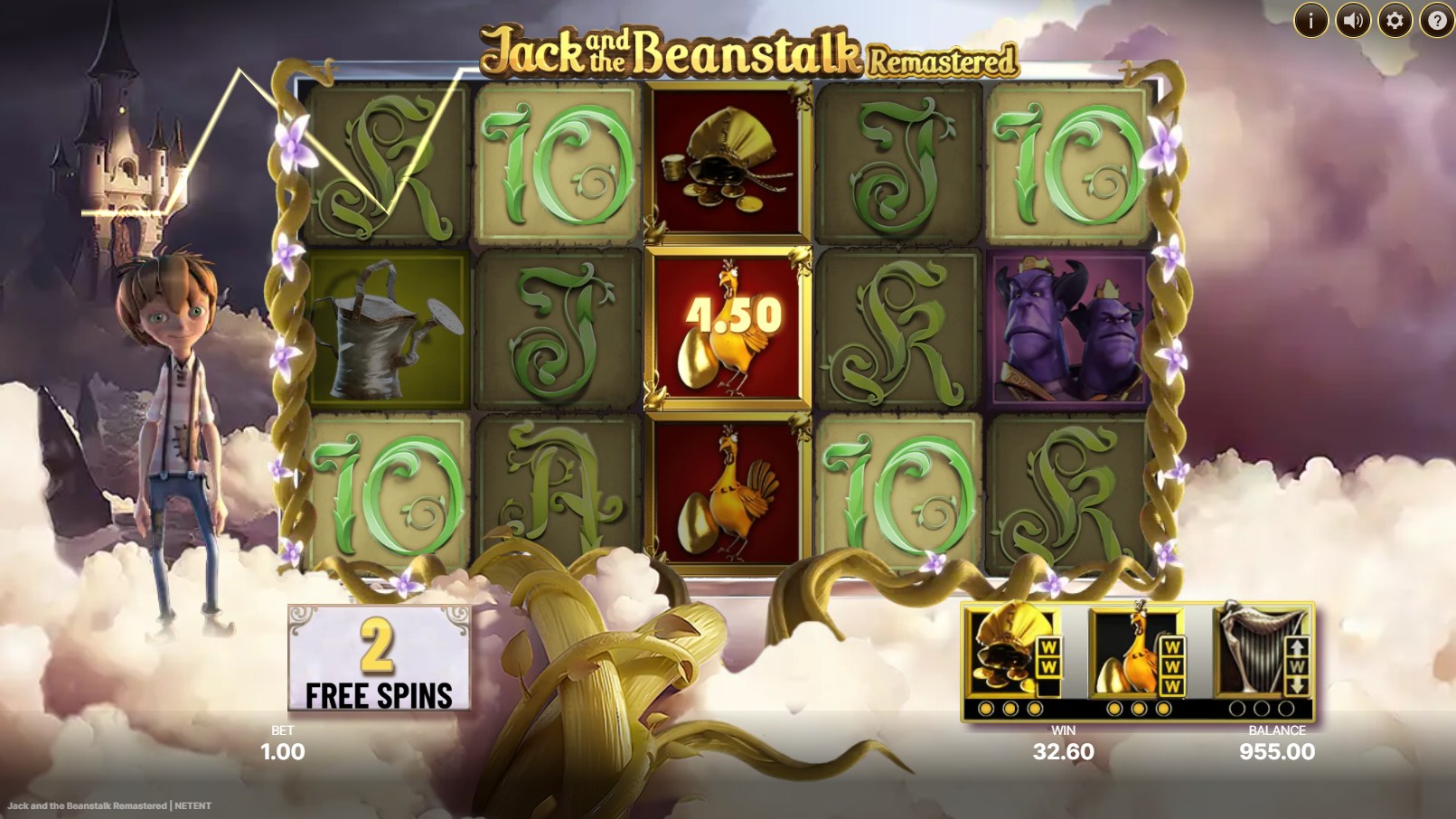 Animations enhance engagement significantly. Jack, depicted as a dynamic character positioned adjacent to the reels, reacts expressively to spin outcomes—celebrating wins with gestures or dismay at near-misses. During key events, the beanstalk visibly extends upward, symbols morph fluidly, and environmental elements shift, such as darkening skies or sparkling effects. Sound-synced transitions, like treasure scatters glowing with ethereal light, maintain immersion. Despite its 2011 origins, the graphics hold up admirably, offering polished 2D art with fluid motion that rivals contemporary standards without relying on 3D excess.