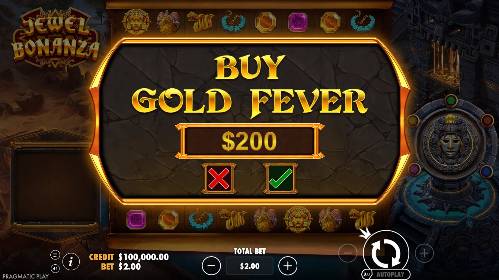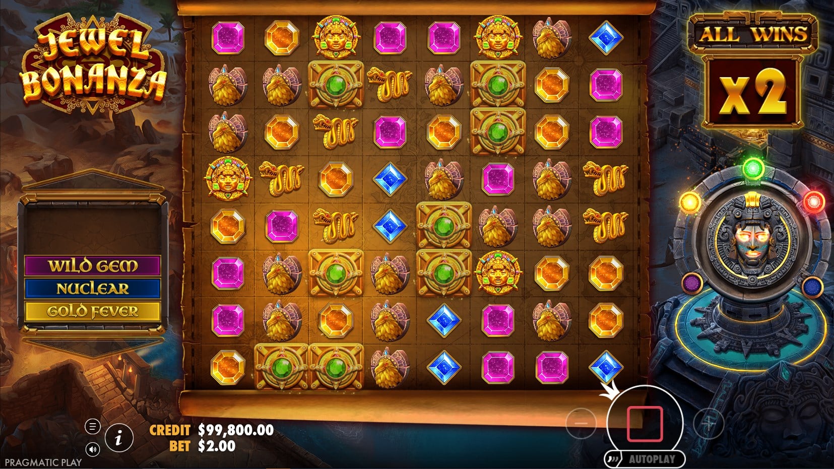 At its core, Jewel Bonanza operates on an expansive 8×8 grid, eschewing traditional paylines in favor of cluster pays mechanics. Wins trigger when five or more identical symbols connect horizontally or vertically (adjacent to one another), paying according to the paytable based on cluster size. Payouts scale generously: low-paying gems (blue, pink, yellow) offer modest returns for smaller clusters but appear frequently; mid-tier necklace and golden snake symbols provide balanced rewards; the totem card delivers solid mid-to-high payouts; and the top-tier golden Aztec coin icon peaks at 1,000x the bet for a full 25+ symbol cluster, incentivizing large formations.