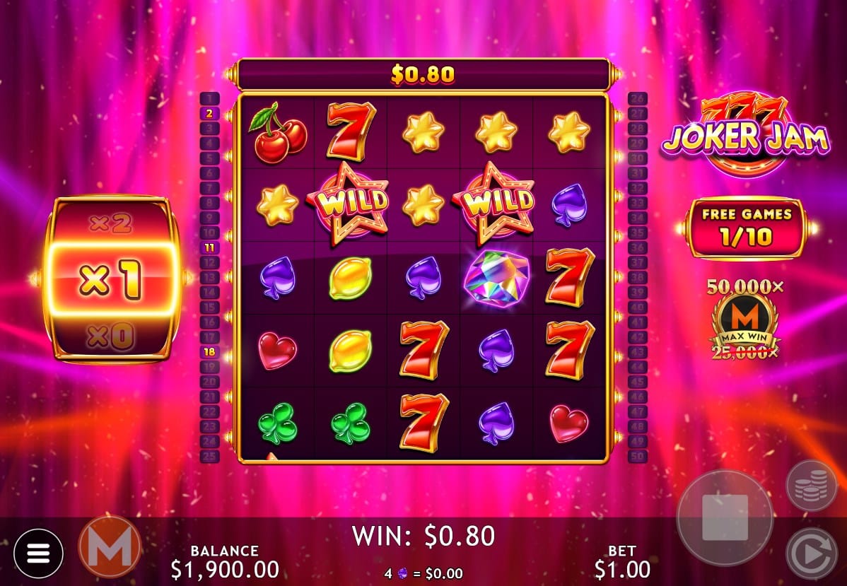 Joker Jam employs a 5-reel, 5-row setup with 50 fixed paylines, where wins are formed by landing matching symbols on adjacent reels from left to right along the paylines. The basic rules are straightforward and accessible: players adjust their bet level, initiate a spin, and receive payouts based on the combinations achieved, with higher-paying symbols such as Jokers, sevens, BARs, and gems delivering the most rewarding returns. Special symbols play a pivotal role: Joker heads contribute to win multiplier progression via a dedicated multiplier reel, while BONUS symbols (scatters) trigger the free spins feature.