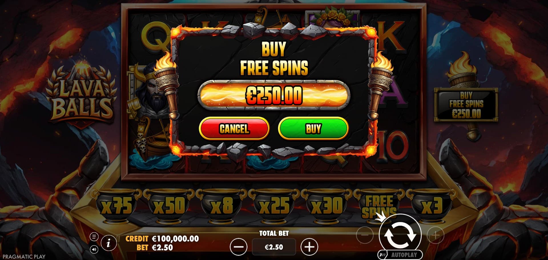 From a performance standpoint, Lava Balls operates with a 96.50% RTP, a hit frequency of 1 in 3.10 spins, and a high volatility math model. Players can expect bursts of excitement punctuated by dry spells — typical of Pragmatic Play’s big-risk, big-reward formula. With a maximum win of 4,800x the bet, a min/max stake range of $0.25–$250, and a Free Spins trigger rate of roughly 1 in 135 spins, this slot offers a high-stakes environment that feels both modern and mythic.