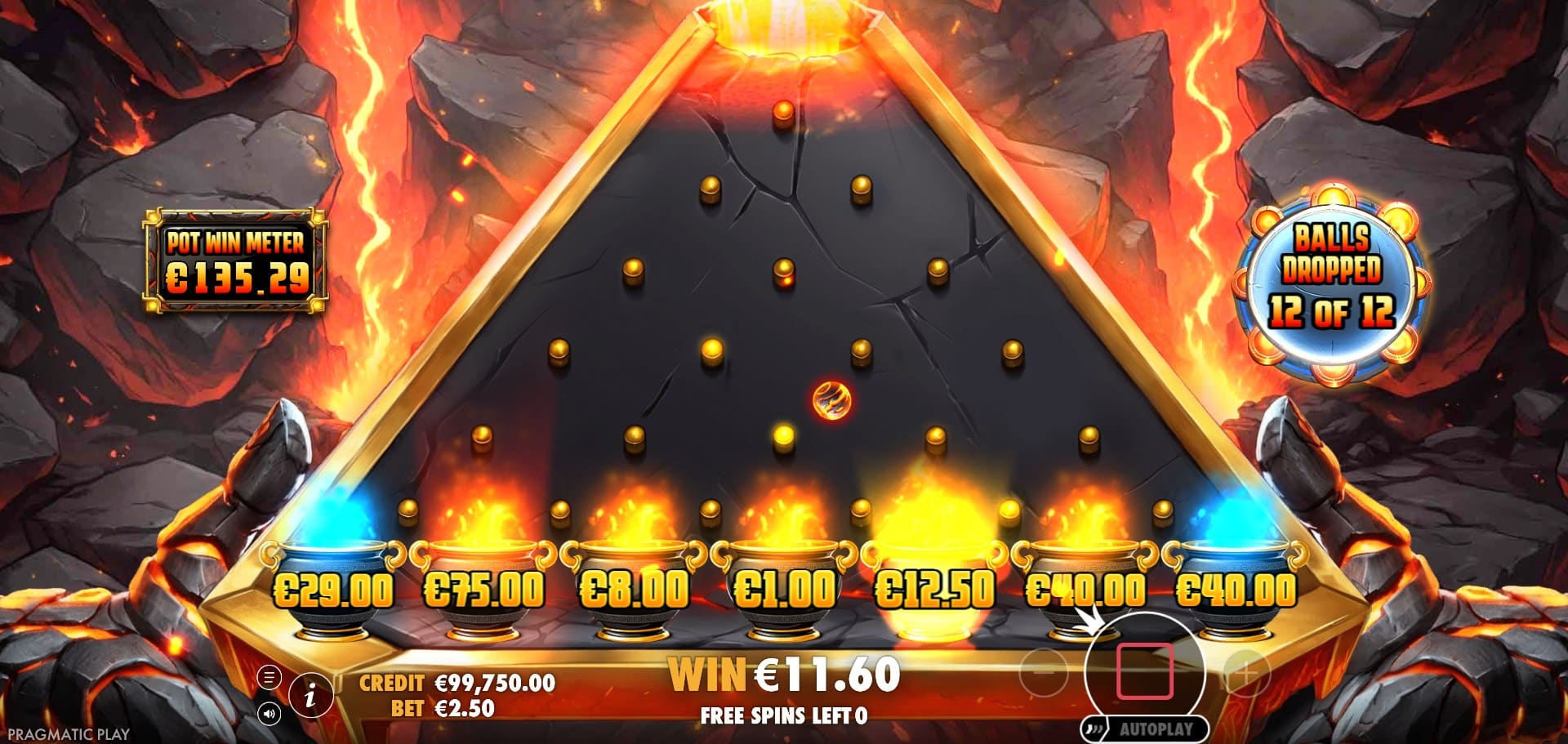 At its core, the base game plays out smoothly, punctuated by the signature Lava Balls Wild Multiplier feature, which activates whenever one or more wilds form part of a winning combination. Before payouts are awarded, a glowing ball drops from above through a 7-pot Plinko grid, potentially landing in pots carrying multipliers or triggering free spins.