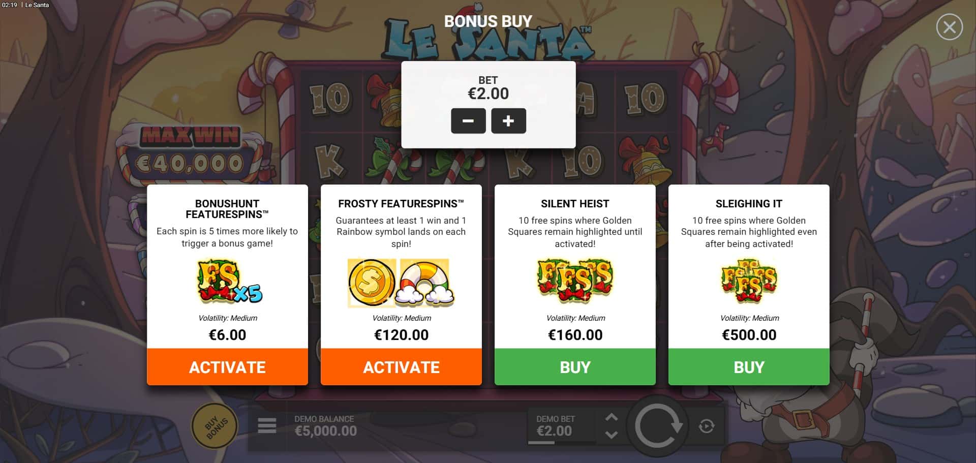Le Santa’s bonuses revolve around enhanced cascades and three progressive Free Spins modes, triggered by 3-5 Scatters. All retain base mechanics with upgrades: