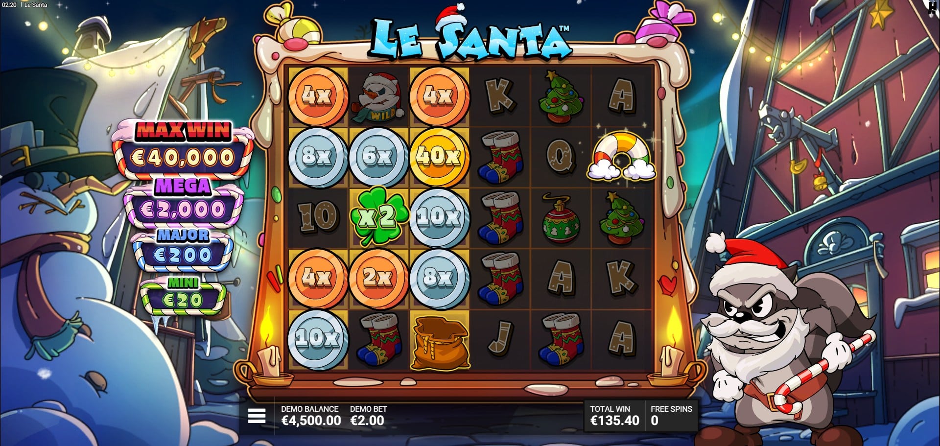 The visual aesthetic of Le Santa captures a whimsical yet cheeky Christmas atmosphere, centered on Smokey the raccoon in a haphazard Santa costume positioned beside the reels. The 6×5 grid sits within a snow-laden forest, with gently falling snowflakes enhancing immersion and a festive soundtrack underscoring the holiday vibe. Animations are smooth during cascades and reveals, featuring sparkling effects for wins, glowing Golden Squares, and dynamic symbol activations like clovers multiplying values or Santa Sacks collecting prizes.