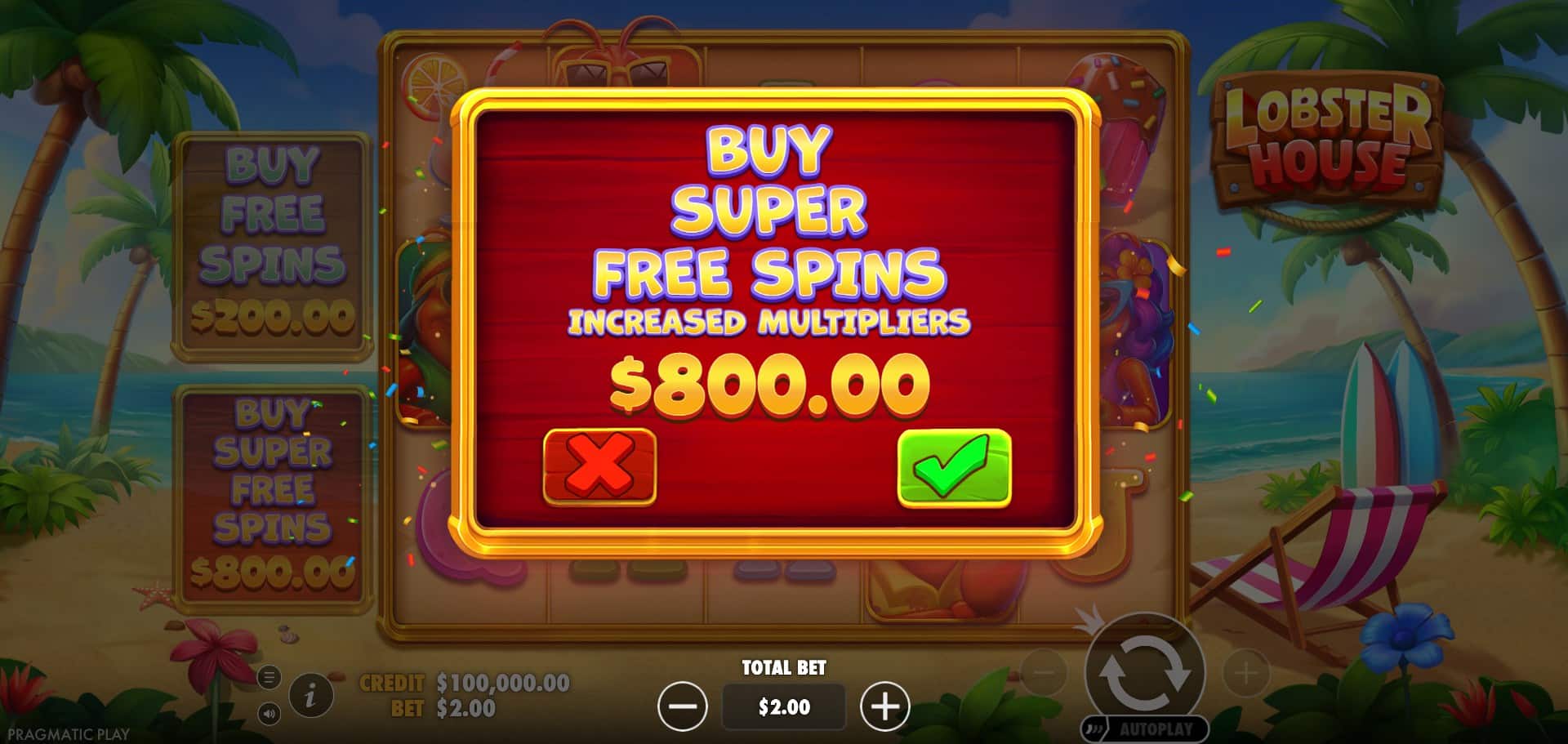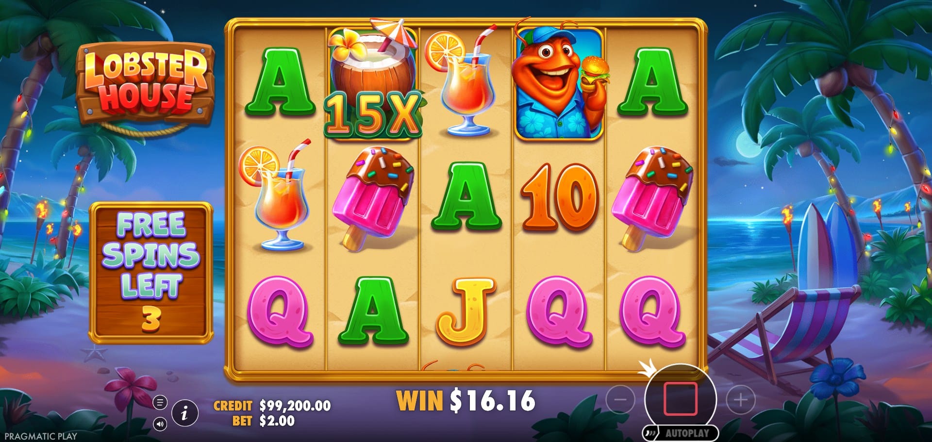 Lobster House delivers a bright, summery experience filled with beach chairs, cocktails, surfboards, ice creams, palm trees, and—of course—grinning lobsters lounging in sunglasses. The slot’s interface bursts with tropical colors: vivid blues of the sea, glowing yellows, coral pinks, and warm sandy browns create a breezy holiday vibe.