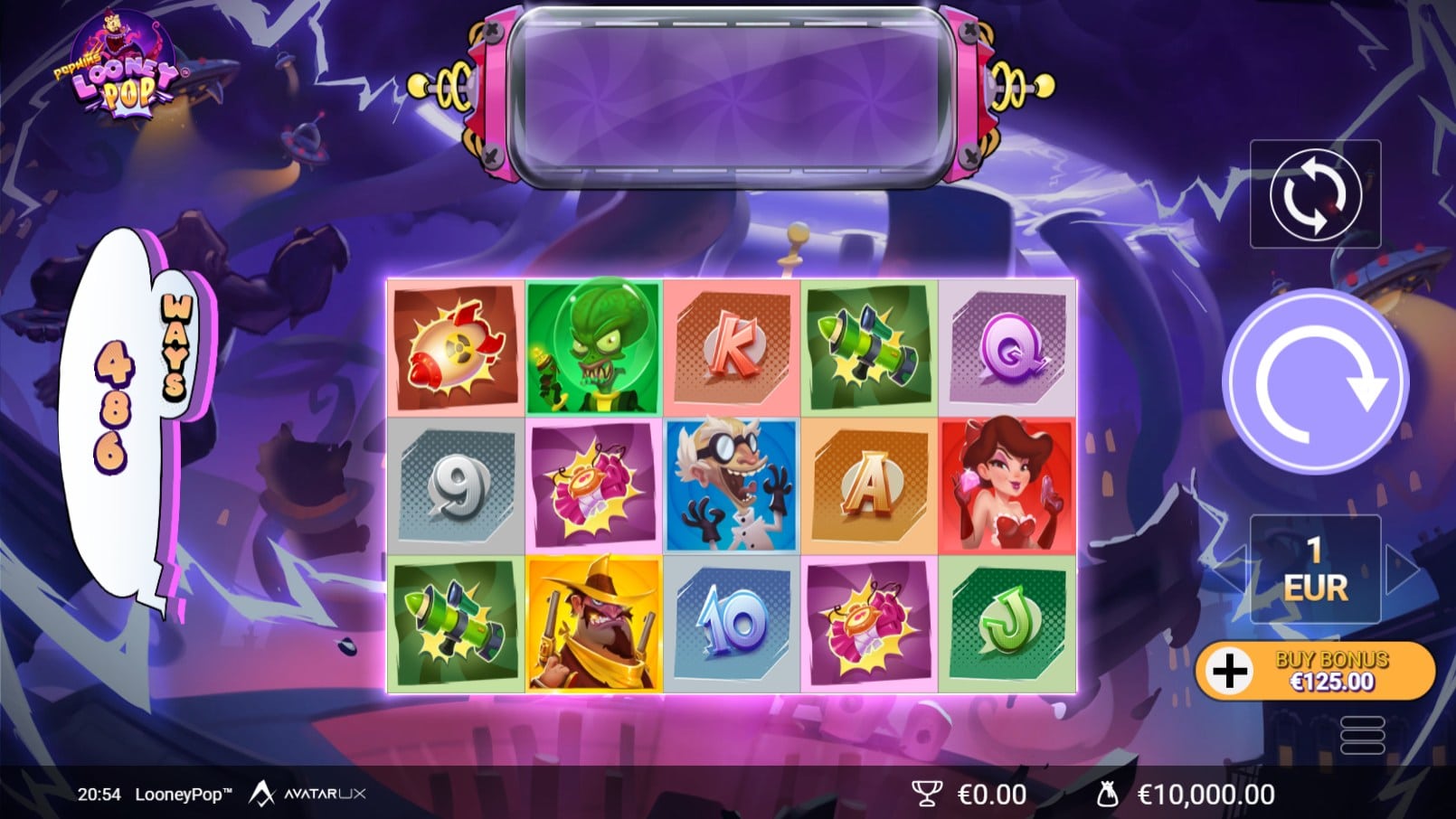 AvatarUX continues to push its PopWins series forward with LooneyPop, a February 2023 release that combines the beloved expanding-reels mechanic with a quirky animated sci-fi theme. Unlike many of the studio’s other titles, which lean on fantasy, animals, or mythological concepts, LooneyPop ventures into the world of aliens, scientists, and over-the-top cartoon chaos. The game’s setting is intentionally vague, leaving room for players to interpret what’s happening—whether it’s an alien invasion or a zany experiment gone wrong.