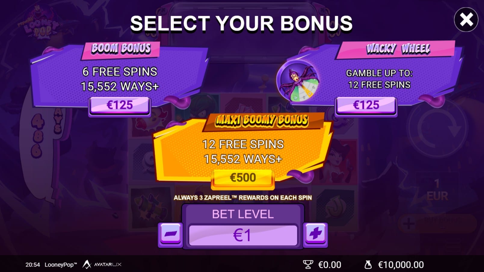 LooneyPop is stacked with innovative bonus elements, most notably the Zap Reel, Free Spins, and Bonus Buy options.