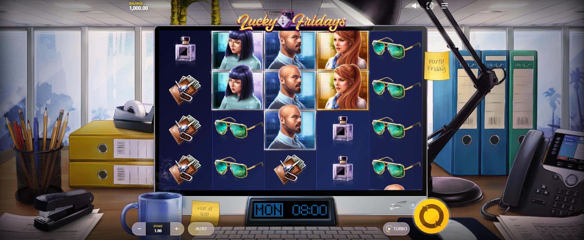 The visual identity of Lucky Fridays is as deliberate as it is effective. The regular mode greets players with an uninspiring office scene. You’ll spot a cluttered desk adorned with tape, staplers, documents, mugs, and the inevitable cup of coffee—viewed through what looks like a dull computer monitor interface. It’s relatable to the point of discomfort for anyone stuck in office monotony.When Party Time hits, the transformation is immediate and satisfying. The screen morphs into a night-time celebration complete with neon lights, cocktails, and dressed-up characters, turning the drab into fab. This split between workday and weekend visuals reinforces the slot’s core theme and keeps things interesting, even when you’re trudging through the weekday spins.