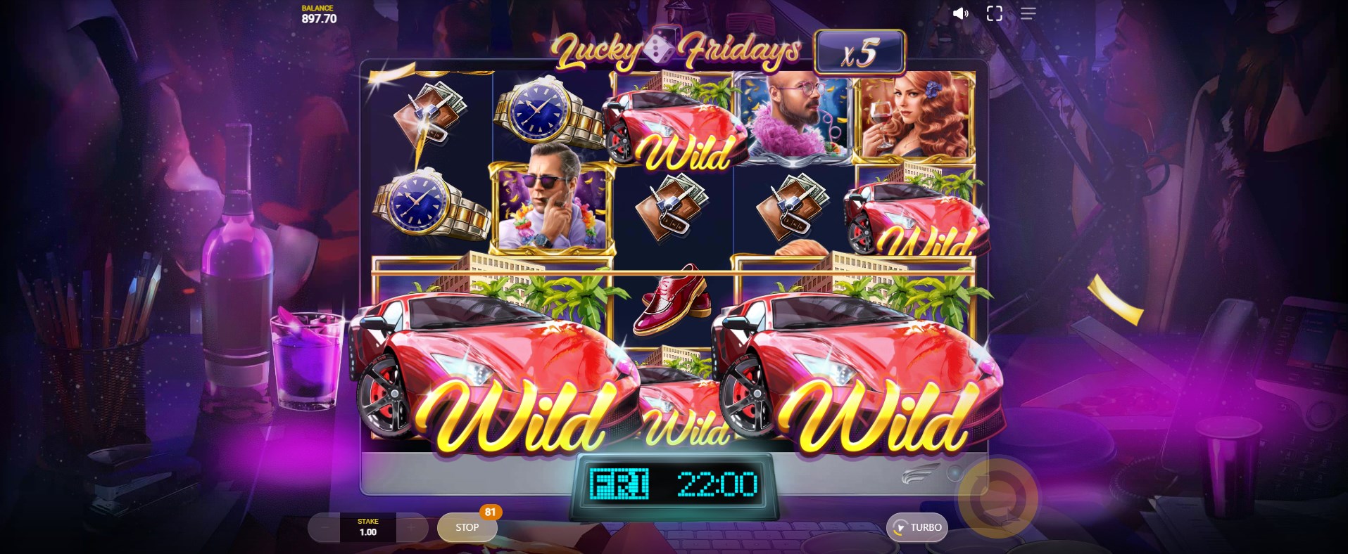 Party Time ModeThis is the core bonus mechanic. Once the in-game clock hits Friday 18:00, Party Time activates automatically. The background changes to a club-like vibe, and all high-paying symbols wear party gear like leis, sunglasses, or cigars.