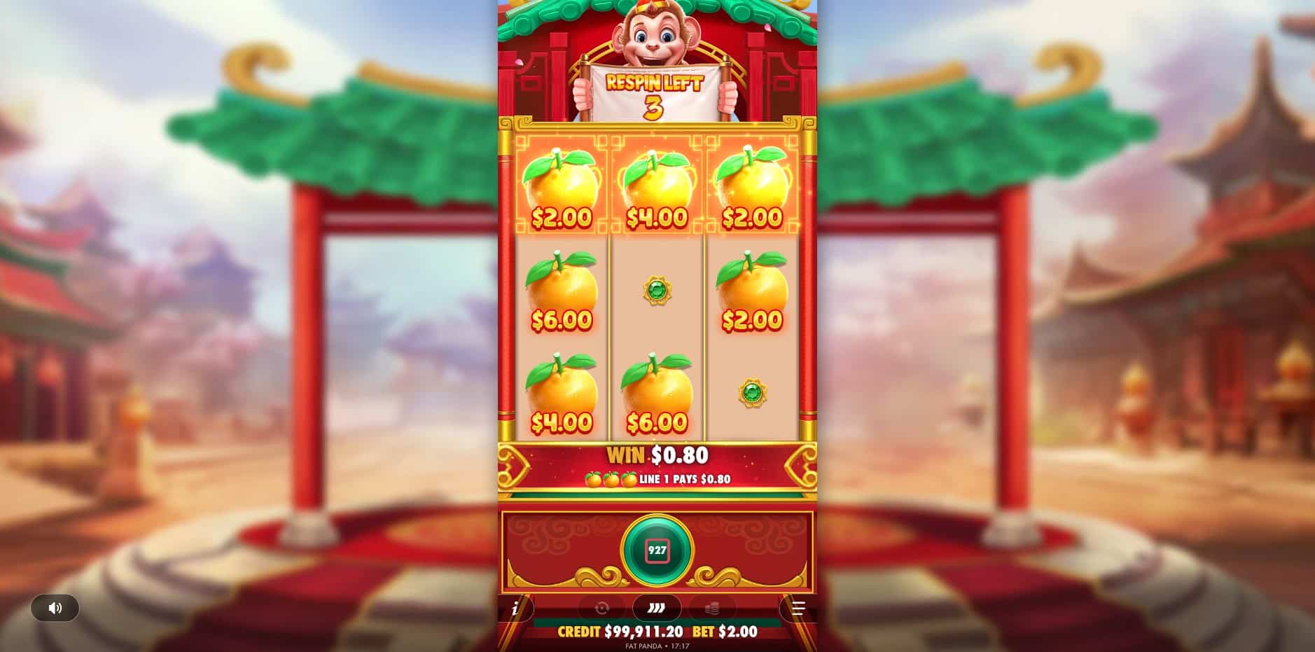 The visuals in Lucky Monkey evoke a vibrant East Asian town atmosphere, centered around a 3×3 reel grid positioned in a lively square. A prominent monkey character sits atop the reels, animated to engage players with expressions and commentary during spins, adding a playful touch. The background showcases traditional elements like ornate architecture, enhancing the festive aesthetic with bright, saturated colors dominated by reds, golds, and oranges for a prosperous feel. Symbols are crisply rendered: low-paying ones include mandarins, firecrackers, and red lanterns, while high-paying icons feature golden coins, a red envelope, and a pot of gold, all detailed with subtle shines and cultural motifs. Animations are smooth and minimalistic, with winning combinations triggering modest explosions of particles and the monkey reacting dynamically. The overall design is polished and cute, prioritizing clarity and immersion without overwhelming effects, ensuring accessibility across devices.