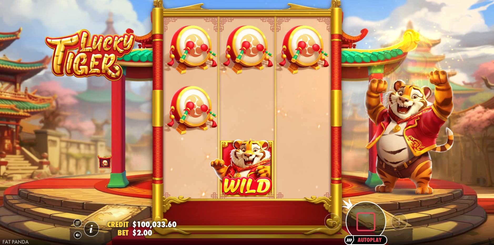 The visuals in Lucky Tiger evoke a vibrant Chinese town during Lunar New Year, with red and green pagoda buildings forming the backdrop and a traditional Chinese soundtrack providing an immersive audio layer. The titular tiger character stands prominently to the right of the reels, holding a multiplier orb, adding a dynamic and thematic focal point. The 3×3 grid is compact and clean, with smooth animations on wins and feature triggers. Symbols include lower-paying icons like the red gourd, scrolls, and drums, alongside higher-value ones such as the golden official hat, Jin-chan money toad, and Maneki-Neko statue. Wild symbols integrate seamlessly, substituting for others with crisp animations. Overall, the aesthetic is polished yet understated, prioritizing readability and thematic consistency without overwhelming effects, ensuring compatibility across devices for a fluid experience.