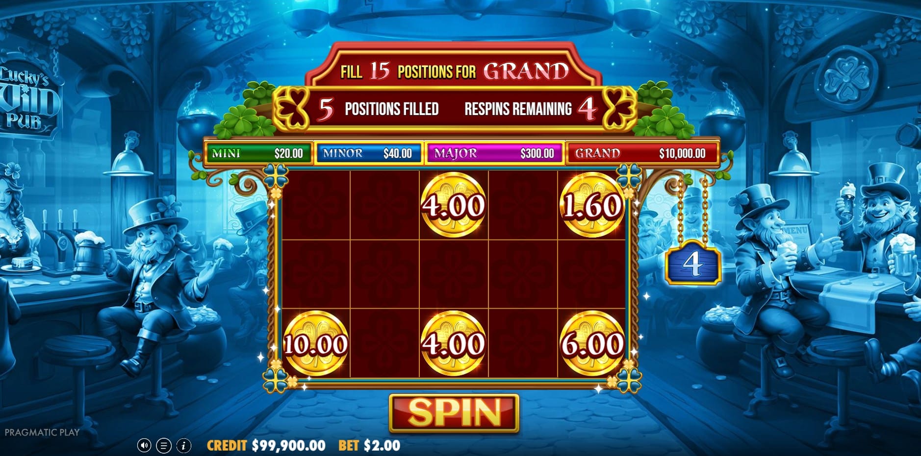 The primary excitement in Lucky’s Wild Pub revolves around the Pot Respins feature, randomly triggered by landing one of three Colored Coin symbols in the base game. This respin bonus clears the grid except for triggering coins, then awards three respins where only Money Symbols (0.6x to 30x bet), Jackpots (10x to 150x), and blanks land. Sticky Money and Jackpot symbols reset the counter to three, with potential for grid-filling wins culminating in the Grand Jackpot of 5,000x if all 15 positions fill.